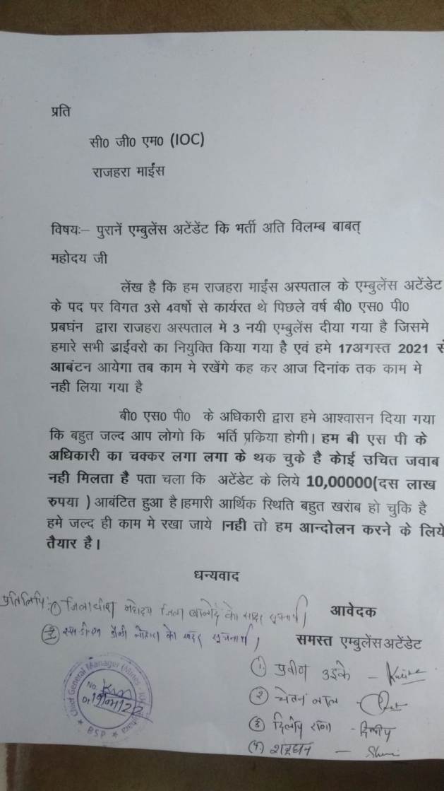 राजहरा माइन्स अस्पताल में एंबुलेंस अटेंडेंट के पद पर विगत तीन-चार वर्षो से कार्य कर रहे ठेका श्रमिकों को पिछले वर्ष अगस्त माह 2021 से अब तक काम में नहीं लिया गया है । ये श्रमिक राजहरा एंबुलेंस सर्विस अंतर्गत राजहरा बीएसपी अस्पताल में कार्य कर रहे थे, किन्तु अस्पताल को जैसे ही 3 एंबुलेंस मिला वैसे ही इन अटेंडरों को नया ठेका होगा तब आप लोगो को सबसे पहले प्राथमिकता मिलेगी आश्वाशन देकर आज दिनांक , 9 माह बीत जाने पर भी बीएसपी प्रबंधन ध्यान नहीं दे रहा, अस्पताल में मरीज को बिना अटेंडर के सिर्फ ड्राइवर के भरोसे भिलाई सेक्टर 9 अस्पताल भेज दिया जाता है, इन अटेंडरों के साथ काम कर रहे ड्राइवरों को नया एंबुलेंस आते ही काम मे रख लिया गया , परंतु इन अटेंडेंट पर सवाल करने से अधिकारी का जवाब स्पष्ट नहीं होता। काम मे 9 माह बीत जाने से इनकी आर्थिक स्थिति बहुत ही दयनीय हो चुकी है, प्रबंधन इनकी ओर ध्यान बिल्कुल भी नहीं दे रहे है इसलिए ड्राइवर एवं अटेंडेंट ने मिलकर पुराने एंबुलेंस अटेंडेंट को जल्द काम मे रखा जाए सी .जी .एम राजहरा माइन्स को ज्ञापन सौंपा