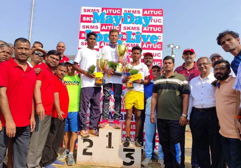 किरंदुल – लौह नगरी किरंदुल में मई दिवस के उपलक्ष में प्रतिवर्ष संयुक्त खदान मजदूर संघ द्वारा विभिन्न कार्यक्रम करते हुए मई दिवस को बड़े ही धूमधाम से मनाया जाता रहा है। इसी तारतम्य में आज नगर में मिनी मैराथन दौड़ का आयोजन किया गया। यह दौड़ किरंदुल के फुटबॉल ग्राउंड से प्रारंभ होकर पूरे नगर का एक चक्कर मारते हुए फुटबॉल ग्राउंड में ही इसका समापन हुआ। मैराथन दौड़ का शुभारंभ मुख्य अतिथि बी.आई.ओ.पी. सीनियर सेकेंडरी स्कूल के प्राचार्य ए. विश्वास, संयुक्त खदान मजदूर संघ के सचिव राजेश संधू एवं अध्यक्ष के साजी ने हरी झंडी दिखाकर प्रारंभ किया। इसकी दूरी लगभग 8 किलोमीटर की थी इस मैराथन दौड़ में 225 प्रतिभागियों ने हिस्सा लिया था। जिसमें इस प्रतियोगिता को 25. 45 मिनट में पूरी कर बस्तर के ललित कुमार वट्टी ने प्रथम स्थान प्राप्त करते हुए पुरस्कार राशि 10,000 नगद व ट्रॉफी अपने नाम किया। द्वितीय स्थान पर कोंडागांव के फुलधर नेताम को 7000 नगद व ट्रॉफी एवं तृतीय स्थान पर बड़े बेड़मा के लक्ष्मण कुमार कुंजाम को 5,000 नगद व ट्रॉफी से नवाजा गया। वहीं इस प्रतियोगिता में टॉप 10 में आए प्रतिभागियों को भी नगद राशि व ट्राफी प्रदान की गई। साथ ही टॉप 50 प्रतिभागियों को मेडल पहना कर सम्मान किया गया। इस मैराथन में बालिकाओं ने भी हिस्सा लिया था उन्हें भी आयोजन समिति की ओर से आकर्षक पुरस्कार प्रदान किए। गए इस पूरे कार्यक्रम को सफल बनाने के लिए एसकेएमएस के संगठन सचिव नोमेश्वर राव, कार्यालय सचिव नरसिम्हा रेड्डी, कोषाध्यक्ष देवेंद्र कटारिया, राजनाथ, मोहम्मद नशाद, सुरेश, राजेश सोनी, एकटेश्वर राव, अमित दीक्षित, रजत राय, आयतु सोरी, डी सूरज, तुलसी, आर.ए.यादव भीमा मरकाम, अजय सिंग,सारथी, मनोज पांडेय, सुमित धर, देव तिवारी,कल्याण रावटे, प्रदीप नामदेव आदि साथियों का विशेष योगदान रहा।