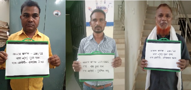 दूसरा व्यक्ति जिसने नाम पता पुछने पर अपना नाम कमलेश कुमार सिन्हा पिता गयाराम सिन्हा उम्र 38 वर्ष वार्ड 06 टेंगना बरपारा थाना गुरूर जिला बालोद छ0ग0 की रहने वाली बताया जिसके कब्जे से एक नग सट्टा पट्टी, एक डाट पेन नीला स्याही, एवं सट्टा पट्टी का नगदी रकम 500 रूपये को जप्त किया गया। तीसरा व्यक्ति जिसने नाम पता पुछने पर अपना नाम लोकमान खान पिता उसमान खान उम्र 56 वर्ष साकिन वार्ड 07 भरदा थाना गुरूर जिला बालोद छ.ग. की रहने वाली बताया जिसके कब्जे से एक नग सट्टा पट्टी, एक डाट पेन नीला स्याही एवं सट्टा पट्टी का नगदी रकम 800 रूपये को जप्त किया गया । आरोपीगणों को अपराध सदर धारा 4(क) जुआ एक्ट के तहत गिरफ्तार किया गया है ।