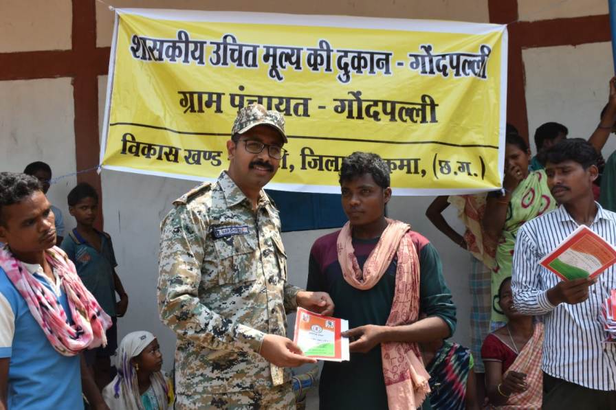 बीजापुर – जिला एवं पुलिस प्रशासन की तत्परता एवं जनहित कार्य से सुकमा जिले के कोंटा ब्लाक अंतर्गत ग्राम पंचायत गोंदपल्ली जैसे सुदूर क्षेत्र में बसे ग्रामीणों को सुगमतापूर्वक राशन उपलब्ध कराया जा रहा है। पूर्व में इस पंचायत के ग्रामीण जो कि राशन लेने 20-25 किलोमीटर तक जगरगुण्डा जाते थे। ग्रामीणों को सुगमतापूर्वक राशन उपलब्ध कराने सिलगेर में राशन दुकान का आज शुभारंभ। डीआईजी दंतेवाड़ा कमलोचन कश्यप सहित जिले में नवपदस्थ पुलिस अधीक्षक ए.वाष्णैव तथा जिला पंचायत सीईओ रवि कुमार साहू, खाद्य अधिकारी गणेश कुर्रे , जिला प्रबंधक नागरिक आपूर्ति निगम घनश्याम कश्यप एवं सुकमा जिले के खाद्य अधिकारी जयवर्धन ठाकुर की उपस्थिति में 298 कार्डधारी ग्रामीण परिवारों को राशन वितरण कार्य शुरु किया गया।