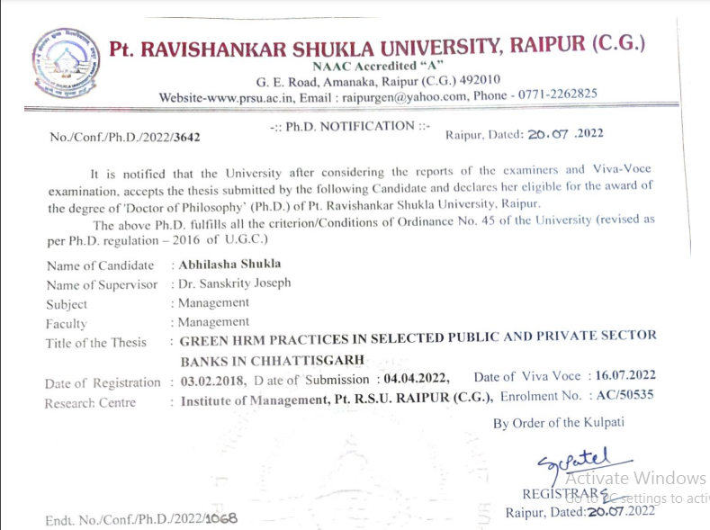 पण्डित रविशंकर शुक्ल विश्वविद्यालय द्वारा अभिलाषा शुक्ला को “ग्रीन एच आर एम प्रेक्टिसेस इन सलेक्टेट पब्लिक एंड प्राइवेट सेक्टर बैंक्स इन छत्तीसगढ़” विषय मेनेजमेंट पर शोध डिग्री प्रदान की गई।