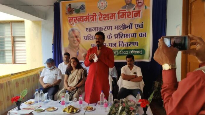 विधायक जगदलपुर एवं संसदीय सचिव (नगरीय प्रशासन एवं श्रम विभाग) रेखचंद जैन ने रेशम विभाग द्वारा आयोजित मुख्यमंत्री रेशम मिशन के तहत आयोजित कार्यक्रम में प्रशिक्षण प्राप्त महिलाओं को संबोधित करते हुए कहा की हमारे प्रदेश के यशस्वी मुख्यमंत्री भूपेश बघेल जी रेशम मिशन के माध्यम से रेशम उत्पादन को बढ़ावा देने एवं संग्राहकों को उचित मूल्य दिलाने के लिए कृत संकल्पित है इस हेतु उन्होंने रैली कोसा को लघु वनोपज के अंतर्गत लाकर इसकी खरीदारी लघु वनोपज संघ के माध्यम से करवा रहे हैं पूर्व में जहां संग्राहकों को पचास पैसे से एक रुपए प्रति कुकुन का मिलता था आज उन्हें 4.20 प्रति कूकून प्राप्त हो रहा है धागाकरण के माध्यम से प्रति किलो 4500- 5000 रुपए प्राप्त हो रहा है यदि उन्हें प्रशिक्षित कर नवीन तकनीक के वैज्ञानिक पद्धति से धागा बनाया जाता है तो इसका मुल्य और अधिक प्राप्त होगा आज 20 महिलाओं को मशीन तथा 30 महिलाओं को प्रशिक्षण प्रमाणपत्र प्रदान किया गया है इसके अलावा और भी लोगों को मशीन प्रदान की जाएगी जिससे की और धागा बनाया जा सके इसके अलावा कपड़ा बनाने के लिए भी प्रशिक्षण दिया जाएगा जिससे की उन्हें और अधिक मूल्य प्राप्त हो सके इस हेतु धन की कोई कमी नहीं होने दी जाएगी