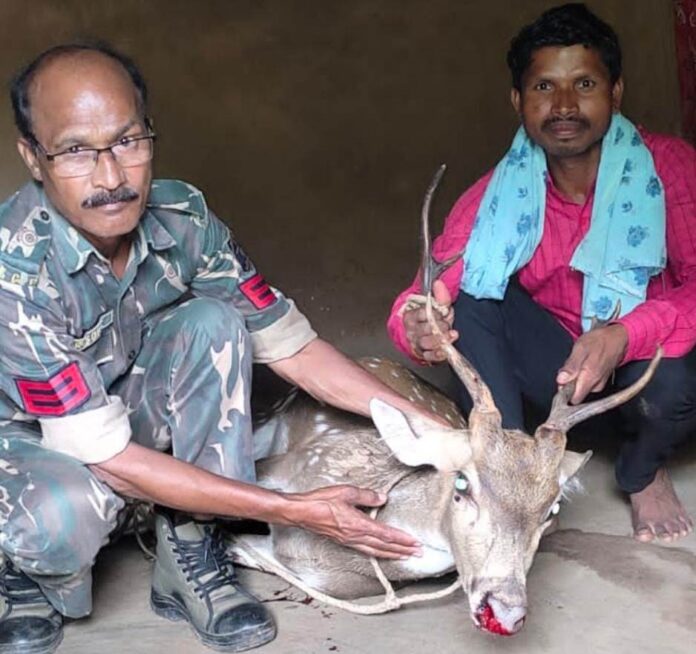 मामले के बारे में भानपुरी डायल 112 ने बताया कि शुक्रवार की सुबह एक मुखबिर ने सूचना दिया कि बाकेल छेपडापारा में एक युवक ने जंगल से एक हिरण के बच्चे को पकड़ने के बाद छुपाकर रखा गया है, सूचना मिलते ही डायल 112 टीम के पंचू राम व चालक वानेश्वर आचार्य मौके के लिए रवाना हुए जहां बाकेल गाँव में अपनी वाहन को खड़ी करने के बाद 300 मीटर के अंदर बस्ती में 2 घंटे की मशक्कत के बाद एक सुना मकान तुलसु का था, जहां एक स्कूली बच्चे ने पुलिस को दूर से एक मकान को दिखाया, जहां पुलिस ने घर मे देखा कि एक हिरण को बांधकर रखा गया था, जो पूरी तरह से लहूलुहान था, हिरण को खोलने के बाद उसे पशु चिकित्सक को बुलाकर उसका उपचार करने के बाद हिरण को वन विभाग को सौप दिया गया