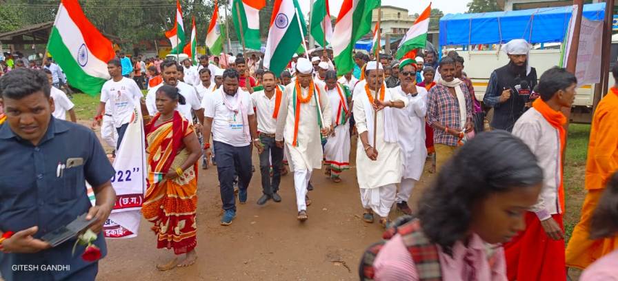कोंडागांव – आजादी कि 75 वीं वर्षगांठ हिरक महोत्सव के रूप में मनाते हुए आजादी गौरव यात्रा के माध्यम से प्रत्येक विधानसभा में 75 किलोमीटर पदयात्रा का आयोजन किया गया है कोंडागांव विधानसभा में कोंडागांव विधायक एवं अध्यक्ष छत्तीसगढ़ प्रदेश कांग्रेस कमेटी मोहन मरकाम के नेतृत्व में कोंडागांव शीतला माता मंदिर से इस आजादी गौरव पदयात्रा का सुभारम्भ किया गया व संबलपुर, कुसमा, कचोरा,बनियागांव, दहीकोंगा,राजागांव, बाखरा, बड़े कनेरा, बड़े बेंदरी, लखनपुरी, भगदेवा, चिपावंड, मुलमुला, धनपुर,फुकागिरोला, डोंगर सिलाटी,कावरा, करमरी, बवई, सलना, मारागांव होते 90 किलोमीटर कि दुरी तय करते हुए बनियागांव, बड़े कनेरा, मुलमुला, करमरी में रात्रि विश्राम करते हुए शामपुर में बरसते पानी के बिच भारी जनसैलाब के साथ आजादी गौरव पदयात्रा का समापन किया गया पदयात्रा के दौरान गांव गांव में तिरंगे के सम्मान व वीर क्रन्तिकारीयों कि बलिदानी को आमजनता व बच्चों के बिच बताया साथ ही सरकार कि योजनाओं का अधिक से अधिक लाभ उठाने प्रेरित किया बताया कि छत्तीसगढ़ सरकार आम जनता कि सरकार है किसानों कि सरकार है जों भी योजना बनाती है आम जनता के हितों का सम्पूर्ण ध्यान रखा जाता है समापन कार्यक्रम में पार्टी के सभी पदाधिकारीयों ने अपना अपना व्यक्तव्य रखा प्रदेश कांग्रेस अध्यक्ष सह कोंडागांव विधानसभा के विधायक मोहन मरकाम ने अपने व्यक्तव्य में तिरंगे के स्थान को सर्वोपरि बताया साथ ही अंग्रेजों के गुलामी से भारत देश को आजाद कराने में जिन वीर क्रान्तिकारीयों का हाँथ था वे सभी कांग्रेस पार्टी के नेता थे।