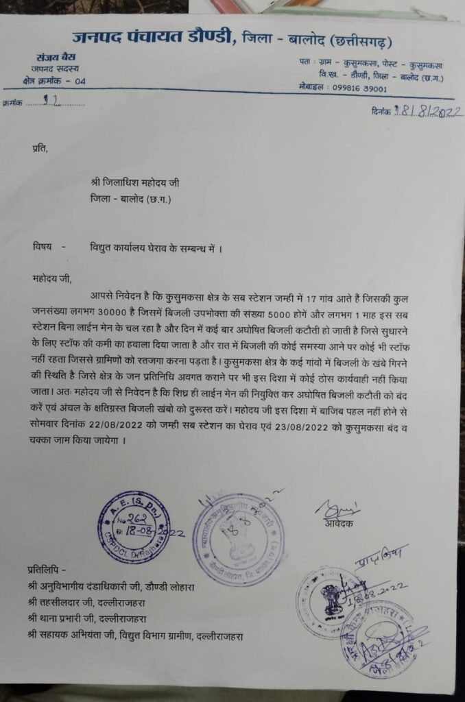दल्लीराजहरा- जनपद पंचायत सदस्य संजय बैंस कुसुमकसा क्षेत्र के द्वारा स्थानीय एसडीएम मनोज मरकाम को जिला कलेक्टर के नाम पत्र सौपते कहा की कुसुमकसा के सब स्टेशन जम्ही में 17 गांव आते हैं जिसकी कुल जनसंख्या लगभग 30000 है जिसमें बिजली उपभोक्ता की संख्या 5000 होगें और लगभग एक माह से इस सब स्टेशन बिना लाईन मेन के चल रहा है और दिन में कई बार अघोषित बिजली कटौती हो जाती है जिसे सुधारने के लिए स्टॉफ की कमी का हवाला दिया जाता है और रात में बिजली की कोई समस्या आने पर कोई भी स्टॉफ नहीं रहता जिससे ग्रामिणों को रतजगा करना पड़ता है।
