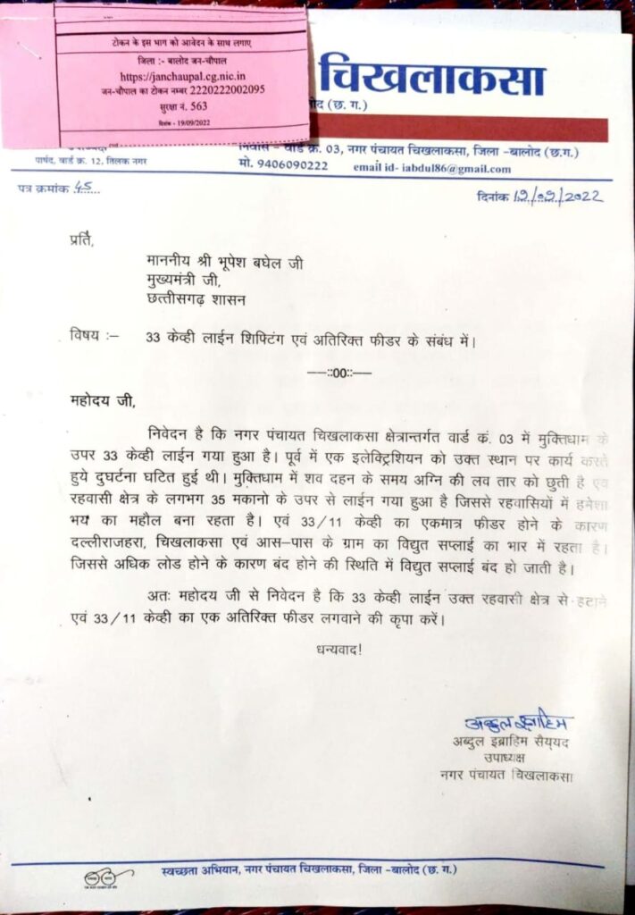 साथ ही विधुत विभाग के संबंध में 33/11 केव्ही लाइन सिंगल फीडर होने के कारण दल्ली चिखलाकसा व आस पास के गाँव मे अधिक भार होने की इस्थिति में विद्युत सप्लाई बंद हो जाती है जिसे डबल लाइन किया जाए 33 केवी लाइन वार्ड क्रमांक 3 मुक्तिधाम के ऊपर 35 मकानों के ऊपर से गया हुआ है जो भी बड़ी दुर्घटना का कारण बन सकता है उसे गंभीरता से लेते हुए शिफ्टिंग किया जाये, रेलवे क्रॉसिंग के संबंध में अटल चौक से कारुटोला मार्ग पर प्रधानमंत्री ग्राम सड़क योजना के तहत सड़क बना हुआ है किंतु बीच में रेलवे पटरी आने पर प्रतिदिन सैकड़ों की संख्या में आवागमन बना रहता है कई बार कई लोगों की जान जा चुकी है उसे देखते हुए माननीय मुख्यमंत्री भूपेश बघेल जी से निवेदन करते हुए अंडर ब्रिज बनाने की मांग कीये।