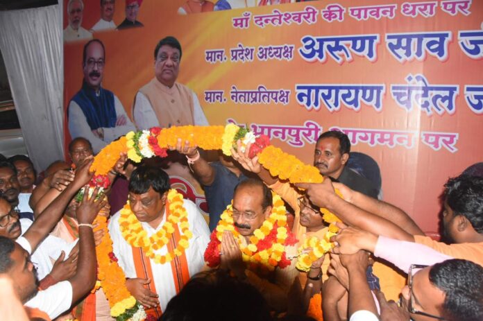 भानपुरी -भारतीय जनता पार्टी प्रदेश अध्यक्ष अरूण साव व नेता प्रतिपक्ष नारायण चंदेल का आज नारायणपुर विधानसभा के प्रथम ग्राम भानपुरी आगमन पर भाजपा कार्यकर्ताओं ने भव्य स्वागत किया