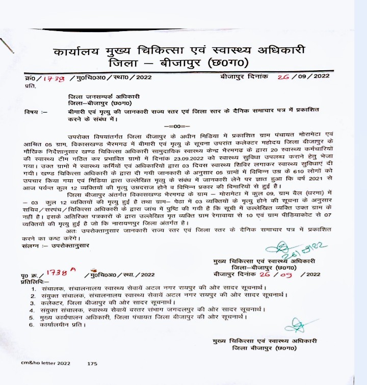उल्लेखनीय है कि बीजापुर और नारायणपुर जिलों के नदी पार स्थित नक्सल प्रभावित दुर्गम गांवों में अज्ञात बीमारी फैलने से दर्जनों लोगों की मौत हो जाने तथा पाचसों लोगों के प्रभावित होने की खबरें मीडिया में आई थीं. बीजापुर जिला प्रशासन ने मसले को गंभीरता से लिया. कलेक्टर के निर्देश पर बीजापुर के मुख्य जिला चिकित्सा एवं स्वास्थ्य अधिकारी ने भैरमगढ़ के खंड चिकित्सा अधिकारी को गांवों में टीम भेजकर ग्रामीणों का ईलाज करने तथा सच्चाई का पता लगाने की हिदायत दी. इसके बाद भैरमगढ़ के बीएमओ ने कथित प्रभावित गांवों में 20 स्वास्थ्य कर्मियों की टीम भेजी. टीम ने ग्राम हितापाल, बैल, उतला, मर्रामेटा, ताकिलोड में घर घर जाकर मौतों के बारे में पता लगाया. तब जानकारी मिली कि सन 2021से अब तक इन गांवों में महज 12 लोगों की ही मृत्यु हुई है और मृतक ज्यादा उम्र के थे तथा लंबे अरसे से बीमार चल रहे थे. स्वास्थ्य विभाग की टीम ने इन गांवों में तीन दिनों तक शिविर लगाकर कुल 610 ग्रामीणों का इलाज किया एवं उन्हें दवाई दी. ये ग्रामीण एनीमिया, ब्लड प्रेशर, सेलूलाइटिस, कमर दर्द,.
