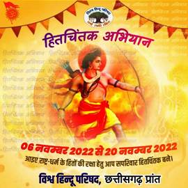 दिनांक 05 नवंबर 2022 जगदलपुर विश्व हिंदू परिषद हित चिन्तक महा अभियान सम्पूर्ण देश भर में चलाया जा रहा है, इसके तहत बस्तर जिले में 50 हजार हित चिंतक बनाने के लक्ष्य के साथ हिन्दू परिवारों से घर घर जाकर संपर्क किया जाएगा । संपर्क के दौरान संगठन के उद्देश्य व पूर्व मे संगठन के किये कार्यो के साथ उन्हें हिंदुत्व पर कुठाराघात करने वालों को मुंह तोड़ जवाब देने के लिए तैयार किया जाएगा अभियान में विहिप व उसके आयाम बजरंग दल, मातृशक्ति, दुर्गा वाहिनी के कार्यकर्ता भी शामिल होंगे। यह अभियान 06 नवंबर से 20 नवंबर तक चलेगा जिसमे प्रत्येक कार्यकर्ताओं की अहम भूमिका रहेगी। विहिप हर हिंदू परिवार को स्वयं से जोड़कर एक वृहद श्रृंखला और विभिन्न जातियों में बटे हुए हिंदू समाज को एक माला में पिरोने का कार्य किया जाएगा l विश्व हिन्दू परिषद की स्थापना सन 1964 में संपूर्ण विश्व के अनेक देशों में निवास करने वाले अपने हिंदू समाज को संगठित करने, जाति, पंथ, भाषा, के भेद को भूलकर मां भारती को पुनः विश्व गुरु के रूप में विराजमान करने हेतू हिन्दुओं के सभी सम्प्रदाओं के गुरुओं, पूजनीय संतो, हिंदू समाज के प्रमुख विचारकों के गहन विचार विमर्श से हिन्दू समाज के रक्षार्थ वीएचपी की स्थापना की गई थीl हिन्दू परिवार से आशा करते है राष्ट्र,धर्म, संस्कृति की रक्षा के विश्व हिन्दू परिषद के हित चिंतक बने , बनाए और चलाए जा रहे इस महा अभियान में भागीदार बने ।