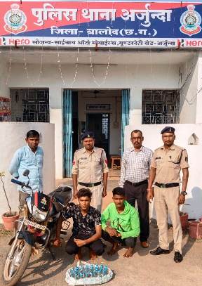 पुलिस अधीक्षक महोदय जितेन्द्र कुमार यादव के मार्गदर्शन, अतिरिक्त पुलिस अधीक्षक हरीश राठौर के निर्देशन एंव अनुविभागीय अधिकारी पुलिस गुण्डरदेही के पर्यवेक्षण में थाना प्रभारी अर्जुन्दा शिशिर पाण्डेय् के नेतृत्व में टीम गठित कर अवैध शराब परिवहन एंव ब्रिकी करने वाले थाना सुरेगांव क्षेत्र के ग्राम सुरेगांव निवासी 01. अभिषेक जोशी पिता शिव कुमार जोशी उम्र 19 साल साकिन सतनामी पारा वार्ड नंबर 10 सुरेगांव थाना सुरेगांव 02. विजय टंडन पिता नारद टंडन उम्र 18 साल साकिन सतनामी पारा वार्ड नंबर 10 सुरेगांव थाना सुरेगांव जिला बालोद को तहसील कार्यालय के पीछे दाउपारा,