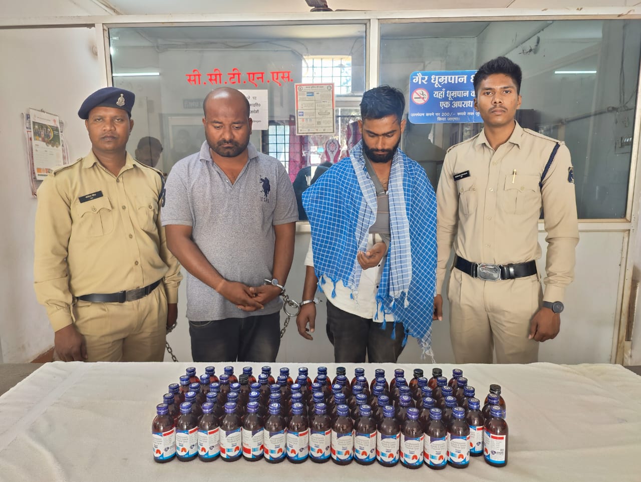 जप्त सामान की कीमत 11,840 रूपए आंकी गई है। उप पुलिस महानिरीक्षक एवं वरिष्ठ पुलिस अधीक्षक श्री जितेन्द्र सिंह मीणा के नेतृत्व में बस्तर पुलिस द्वारा आपराधिक तत्वों के विरूद्ध अभियान चलाकर लगातार कार्यवाही की जा रही है। इसी तारतम्य में नशीली दवाइयों की बिक्री एवं संग्रहण करने वाले तस्करों पर कार्यवाही करने में बस्तर पुलिस को पुनः सफलता मिली है। ज्ञात हो कि थाना केातवाली को सूचना प्राप्त हुई थी कि पथरागुड़ा क्षेत्र में किसी व्यक्ति द्वारा अवैध एवं प्रतिबंधित नशीली सीरप की तस्करी की जा रही है। इस सूचना पर उप पुलिस महानिरीक्षक एवं वरिष्ठ पुलिस अधीक्षक जितेन्द्र सिंह मीणा के मार्गदर्शन एवं अतिरिक्त पुलिस अधीक्षक निवेदिता पाॅल, नगर पुलिस अधीक्षक विकास कुमार के पर्यवेक्षण में निरीक्षक एमन साहू, धनंजय सिन्हा के नेतृत्व में टीम गठित कर कार्यवाही हेतु पथरागुड़ा की ओर रवाना किया गया। इस टीम ने पथरागुड़ा माता मंदिर के पास दो संदिग्ध व्यक्तियों को घेराबंदी कर पकड़ा। पूछताछ में दोनो ने अपने नाम बताए एवं ड्रग तस्करी में लिप्तता की बात कबूल कर ली। दोनों के पास से मालेनेट सीरप 80 नग शीशी प्रत्येक में 100 एमएल सीरप की मात्रा कुल 8 लीटर, मिली। यह सिरप प्रतिबंधित एवं नशीली दवाई की श्रेणी में आता है। पूछताछ में आरोपी सीरप के संबंध में कोई दस्तावेज प्रस्तुत नहीं कर पाए किया। दोनोvके विरूद्ध धारा 21 एनडीपीएस एक्ट के तहत अपराध पंजीबद्ध कर मामले की जांच की जा रही है। आरोपियों को पकड़ने में निरीक्षक एमन साहू, व धनंजय सिन्हा, उप निरीक्षक मनोज तिर्की, अमित सिदार, सहायक उप निरीक्षक दिनेश उसेंडी, आरक्षक प्रकाश नायक, रवि सरदार, भूपेंद्र नेताम की विशेष भूमिका रही।