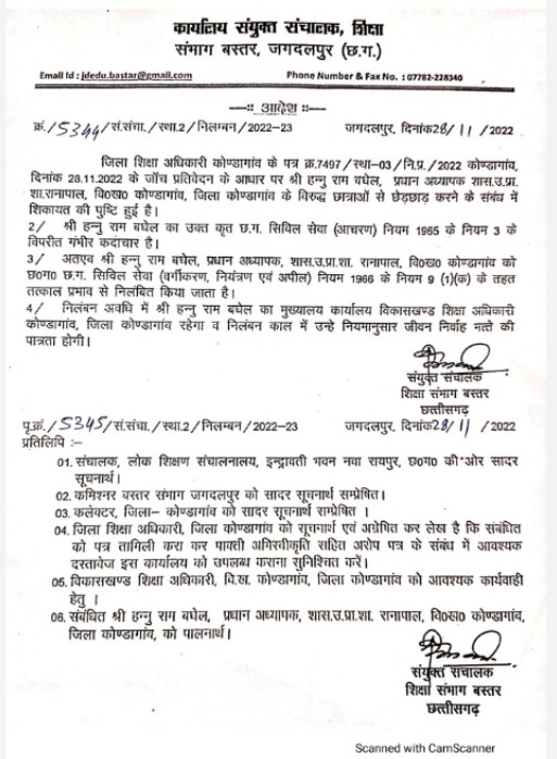 जगदलपुर विकासखंड कोंडागांव की शासकीय उच्च प्राथमिक शाला रानापाल के प्रधान अध्यापक हन्नूराम बघेल को छात्राओं के साथ अश्लील हरकतें करने के आरोप में निलंबित कर दिया गया है। निलंबन अवधि में बघेल का मुख्यालय व कार्यालय विकासखंड शिक्षा कार्यालय कोंडागांव रहेगा।