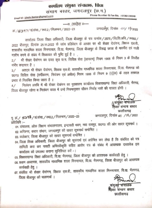 बीजापुर / भैरमगढ़ छात्रा से गाली गलौज और मारपीट करना एक शिक्षक को भारी पड़ गया। संयुक्त संचालक लोक शिक्षण बस्तर ने मरखना और गालीबाज शिक्षक को सस्पेंड कर दिया है। निलंबित शिक्षक को विकासखंड शिक्षा अधिकारी कार्यालय भैरमगढ़ में अटैच किया गया है।मामला भैरमगढ़ विकासखंड की एलबी शासकीय माध्यमिक शाला मिनगापाल का है। इस शाला के शिक्षक शेखर देवांगन ने शाला की ही एक छात्रा से बेवजह गालीगलौज और मारपीट की थी। छात्रा ने घर जाकर अपने पालकों को घटना की जानकारी दी। इसके बाद मामले ने तूल पकड़ लिया। पालकों और अन्य ग्रामीणों ने स्कूल जाकर आपत्ति दर्ज कराई और शिक्षक के कृत्य का भारी विरोध किया। मामले की शिकायत विकासखंड शिक्षा अधिकारी भैरमगढ़ एवं जिला शिक्षा अधिकारी बीजापुर से की गई। जिला शिक्षा अधिकारी ने घटना की जांच कराई, तो शिक्षक के कृत्य की पुष्टि हो गई। जिला शिक्षा अधिकारी शिक्षक शेखर देवांगन पर कार्रवाई की सिफारिश करते हुए संयुक्त संचालक को पत्र भेजा था। संयुक्त संचालक ने शिक्षक श्री देवांगन के कृत्य को छत्तीसगढ़ सिविल सेवा आचरण नियम के विपरीत करार देते उन्हें निलंबित करते हुए विकासखंड शिक्षा कार्यालय भैरमगढ़ में अटैच कर दिया है।