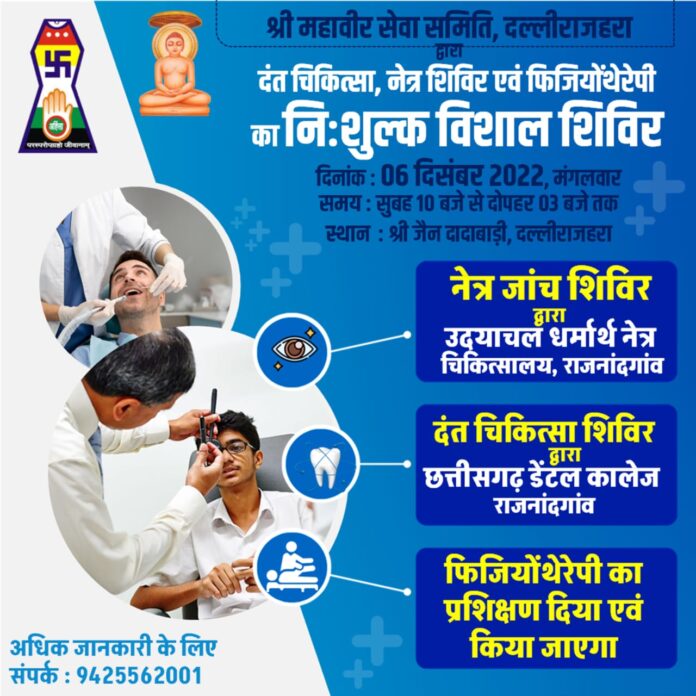 छत्तीसगढ़ डेंटल कॉलेज ऑफ इंसिट्यूट एंड रिसर्च सेंटर राजनांदगाव् के मार्गदर्शन में महावीर सेवा समिति दल्ली राजहरा के तत्वाधान में नेत्र,दंत एवं फिजियोथेरपी शिविर का आयोजन दिनांक 06 दिसंबर 2022 दिन मंगलवार को जैन दादाबाड़ी मे सुबह 10 बजे से दोपहर 3 बजे तक किया जा रहा ।इस शिविर में राजनांदगाव से पधारे हुए वरिष्ठ अनुभवी डॉक्टरो की सेवाएं उपलब्ध कराई जावेगी । जिसमे आँखो के नंबर के जाँच कि सुविधा भी उपलब्ध रहेगी। अतः आप सभी शहरवासियों से सादर अनुरोध है कि इस स्वास्थ्य शिविर में उपस्थित होकर अपने रोगों का निदान कर स्वस्थ्य बने।