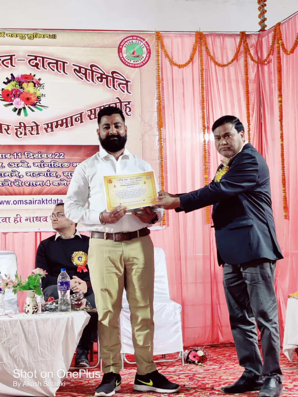 डी बी ग्रुप रक्तदान की सेवा को मिला राज्य सम्मान ओम साई रक्तदान सेवार्थ समिति के द्वारा अंबिकापुर के भटगांव में राज्यस्तरीय सम्मान समारोह किया गया जिसमे नगर के डीबी ग्रुप को क्षेत्रीय विधायक एवम खाद्य मंत्री के द्वारा सम्मान किया गया विगत 7 वर्ष से रक्तदान के क्षेत्र में जिले में अपना सेवा प्रदान कर रहे है ग्रुप के सचिव पवन सोनी ने बताया कि हमारी संस्था रक्तदान रक्त जागरूकता दवाई दान बच्चो का इलाज करा रही है कोरोना महामारी के समय ऑक्सीजन मशीन निशुल्क उपलब्ध कराया गया सुमित जैन ने बताया संस्था को दो नेशनल अवार्ड व 12 राज्यस्तरीय सम्मान किया गया है संस्था के संस्थापक अध्यक्ष दीपक साहू ने कहा हमारी सेवा कार्य आगे भी जारी रहेगा आज का जो सम्मान हमे मिला है ये हमारे नगर के सभी रक्तविरो को समर्पित है रक्तमित्रो के अनमोल रक्त से ही लोगो की जान बच रही है बिना रक्तवीरो के कोई भी संस्था आगे कार्य नही कर सकता सभी का साथ सहयोग लगातार मिल रहा है संस्था के सदस्य लक्ष्मण भरत देवांगन नियाज़ खान,मोहमद मेराज, हेमंत दानेश आर्य शिवा सूर्यवंशी मजीद खान संतोष क्षितिज ,कोमल ठाकुर।