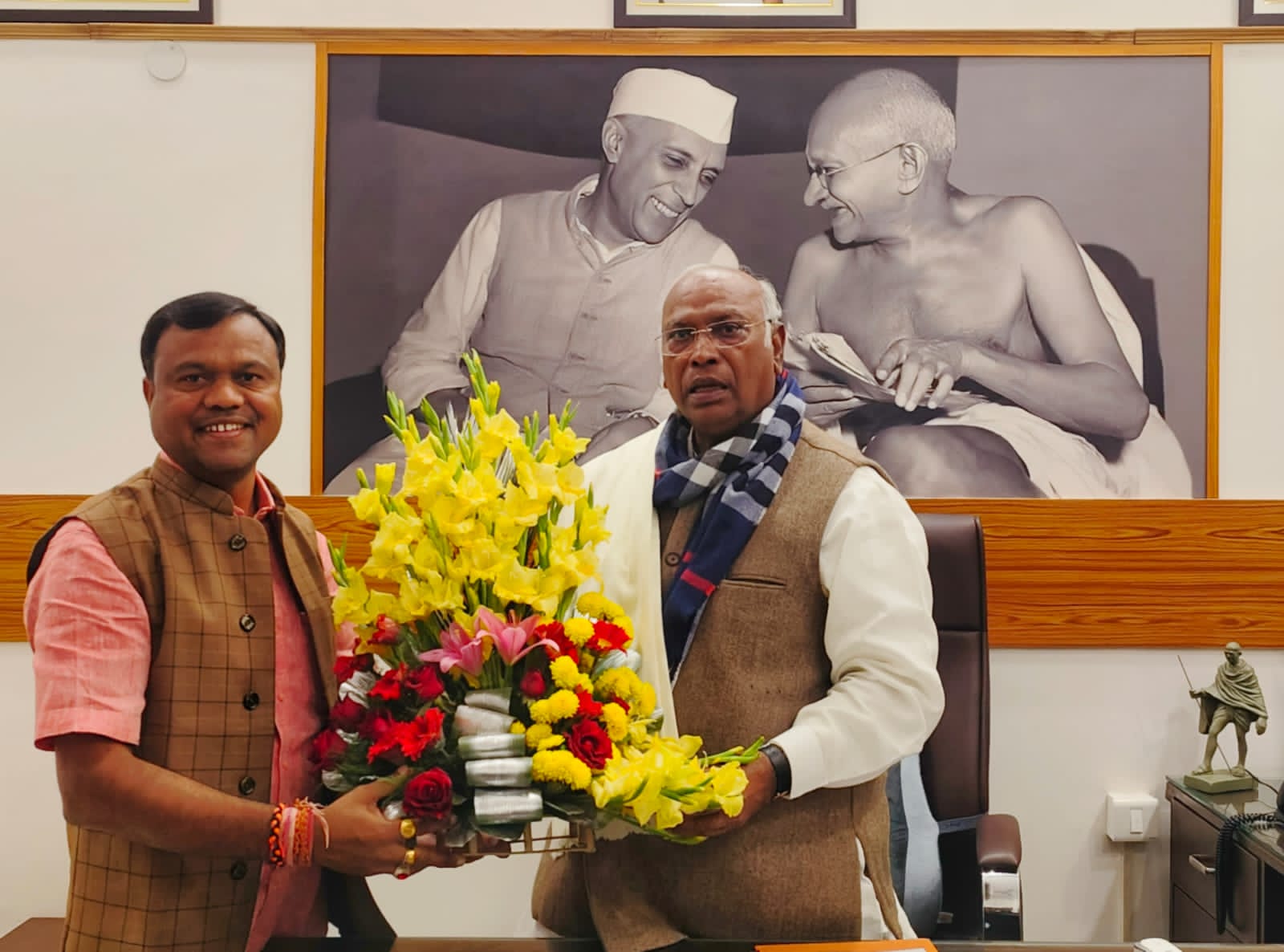 जगदलपुर बस्तर सांसद दीपक बैज ने नई दिल्ली स्थित कांग्रेस मुख्यालय में अखिल भारतीय राष्ट्रीय कांग्रेस के नवनियुक्त राष्ट्रीय अध्यक्ष मल्लिकार्जुन खड़गे से सौजन्य मुलाकात की। बैज ने खड़गे को पार्टी के राष्ट्रीय अध्यक्ष की कमान सम्हालने पर तथा हिमाचल प्रदेश के विधानसभा चुनावों में कांग्रेस को मिली ऐतिहासिक जीत के लिए बधाई एवं शुभकामनाएं दी। श्री खड़गे के साथ बैज की संक्षिप्त चर्चा भी हुई। बैज ने कांग्रेस के राष्ट्रीय अध्यक्ष को बताया कि मुख्यमंत्री भूपेश बघेल और पार्टी के प्रदेश अध्यक्ष मोहन मरकाम के सफल नेतृत्व में छत्तीसगढ़ में कांग्रेस का जनाधार तेजी से बढ़ रहा है तथा और भी मजबूत हो रहा है।