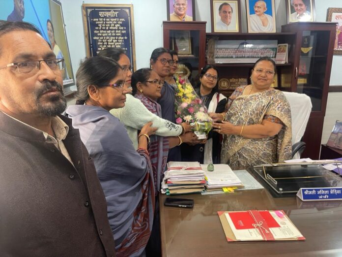 अखिल भारतीय आंगनबाड़ी कर्मचारी संघ बी. एम. एस से संबंध आंगनबाड़ी कार्यकर्ता सहायिका संघ छत्तीसगढ़ के आह्वान पर पूरे प्रदेश भर में पिछले 8 दिनों से जारी अनिश्चितकालीन आंदोलन को आज महिला एवं बाल विकास मंत्री अनिला भेड़िया के आश्वासन के उपरांत स्थगित कर दिया गया है। एक प्रेस बयान में संघ की प्रदेश उपाध्यक्ष सोनिया मरावी एवं महामंत्री संतोषी राजवाड़े ने बताया कि आज दोपहर संघ के एक प्रतिनिधिमंडल महिला एवं बाल विकास मंत्री जी से उनके निवास पर मुलाकात कर आंगनबाड़ी बहनों की प्रांत व्यापी समस्याओं पर चर्चा की तथा उनसे इसके निराकरण का अनुरोध किया गया साथ ही वर्तमान राज्य सरकार द्वारा चुनाव पूर्व आंगनबाड़ी कार्यकर्ताओं / सहायिकाओं को न्यूनतम वेतन देने के वायदे की याद दिलाकर उन्हें पूरा करने का निवेदन किया गया, जिस पर मंत्री महोदया ने बजट सत्र में इस पर प्रावधान करने का वचन दिया