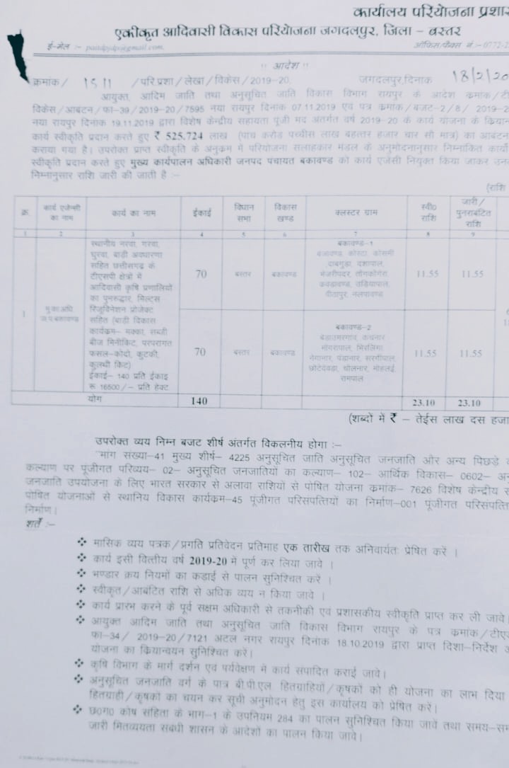 आदिवासियों की कृषि प्रणाली के पुनरोद्धार, मिल्ट्स रिज्यूविनेशन प्रोजेक्ट समेत बाड़ी विकास कार्यक्रम के लिए दो कलस्टर में बकावंड विकास खंड के डेढ़ दर्जन से भी अधिक गांवों के किसानों का चयन हुआ था। बकावंड – 1 के तहत ग्राम बजावंड, कोरटा, कोसमी, दाबगुड़ा, दशापाल, भेजरीपदर, तोंग कोंगेरा, कवड़ावंड, उड़ियापाल, पीठापुर व नलपावंड के आदिवासी किसान चयनित हुए थे। वहीं दूसरे कलस्टर में बकावंड – 2 के तहत बेड़ा उमरगांव, कचनार, मोंगरापाल, मीरलिंगा, नेगानार, पंडानार, सरगीपाल, छोटे देवड़ा, चोलनार, मोहलई व रामपाल गांवों के हितग्राही किसानों को योजना का लाभ देने का दावा किया गया है। जबकि जमीनी हकीकत कुछ और है। इन दोनों कलस्टर के लिए कुल 23 लाख 10 हजार रु. स्वीकृत किए गए थे।