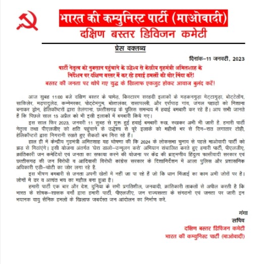 - माओवादी संगठन ने सुरक्षा बलों पर लगाया हेलीकाप्टर से जंगलों में बम बरसाने का आरोप