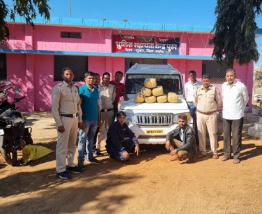 अवैध मादक पदार्थ गांजा की तस्करी एवं परिवहन के रोकथाम हेतु पुलिस सहायता केन्द्र पुरूष के पुलिस पार्टी द्वारा क्षेत्र में नशीले पदार्थ के परिवहन पर अंकुश लगाने हेतु दिनांक 04.02- 2023 को उप निरीक्षक अरुण कुमार साहू के हमराह पुलिस स्टाफ के शासकीय वाहन क्रमांक CG-03-8570 से एम०सी०पी० कार्यवाही हेतु फागुनदाह तिराहा ग्राम पुरूर के पास रवाना होकर वाहनों की चेकिंग कार्यवाही की जा रही थी उसी दौरान बोलेरो वाहन क्रमांक MP 18-T-3451 आया जिसे रोककर नाम पता पूछने पर ड्रायवर सीट पर बैठा व्यक्ति अपना नाम शोक हरण लीकेश पिता रमाकांत जाति महारा उम्र 22 वर्ष निवासी ग्राम सरईटोला थाना राजेन्द्रग्राम जिला अनुपपुर (HORO) एवं बगल सीट पर बैठा व्यक्ति अपना नाम मनोज कुमार तेन्दवे पिता लल्ला प्रसाद जाति महारा उम्र 22 वर्ष निवासी ग्राम सोनियानार थाना राजेन्द्रग्राम जिला अनुपपुर (म0प्र0) का रहने वाल बताया तलाशी लेने पर बोलेरो वाहन क्रमांक MP-18-T-3451 के पीछे सीट के पीछे 07 पैकेट मादक पदार्थ गांजा कुल वजनी 33.200 किग्रा० किमती 3,32,000 / रूपया मिला एवं घटना में प्रयुक्त बोलेरो वाहन क्रमांक MP-18-T-3451 किमती लगभग 7,00,000/ रू० कुल जुमला 10,32,000/ रूपये को जप्त कर कब्जा पुलिस लिया एवं अपराध धारा 20 (ख) NDPS ACT कायम कर आरोपी 1. शोक हरण लोकेश पिता रमाकांत जाति महारा उम्र 22 वर्ष निवासी ग्राम सरईटोला थाना राजेन्द्रग्राम जिला अनुपपुर (म0प्र0) 2. मनोज कुमार तेन्दवे पिता लल्ला प्रसाद जाति महारा उम्र 22 वर्ष निवासी ग्राम सोनियानार थाना राजेन्द्रग्राम जिला अनुपपुर (म0प्र0) को गिरफ्तार कर न्यायिक रिमाण्ड पर भेजा गया है।