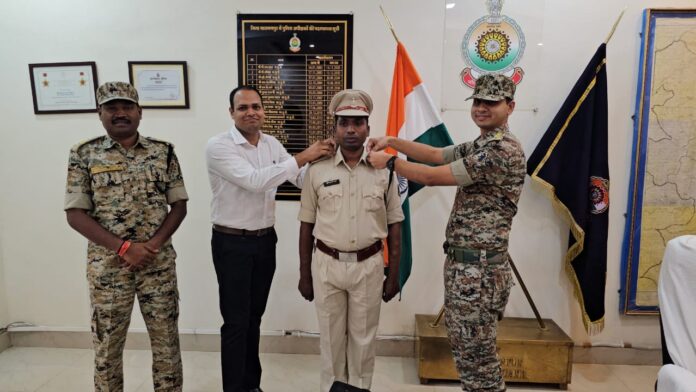 नारायणपुर नक्सलवाद के खिलाफ जंग में अदम्य साहस का परिचय देते हुए दो नक्सलियों को मार गिराने वाले नारायणपुर जिला पुलिस बल के दो कर्मियों को आउट ऑफ टर्न प्रमोशन मिला है। इन पदोन्नत कर्मियों में एक सब इंस्पेक्टर को इंस्पेक्टर और एक प्रधान आरक्षक को सहायक उप निरीक्षक का ओहदा दिया गया है। सोमवार को इन दोनों जवानों के लिए स्टार सेरेमनी का आयोजन कर उनकी वर्दी पर स्टार लगाए गए।पुलिस अधीक्षक पुष्कर शर्मा के नेतृत्व में नारायणपुर जिले में नक्सल विरोधी अभियान सफलतापूर्वक चलाया जा रहा है। नक्सल विरोधी अभियान में अदम्य साहस एवं वीरता का परिचय देने वाले अधिकारी, जवानों को क्रम से पूर्व पदोन्नति का आदेश पुलिस मुख्यालय रायपुर द्वारा जारी किया गया था।