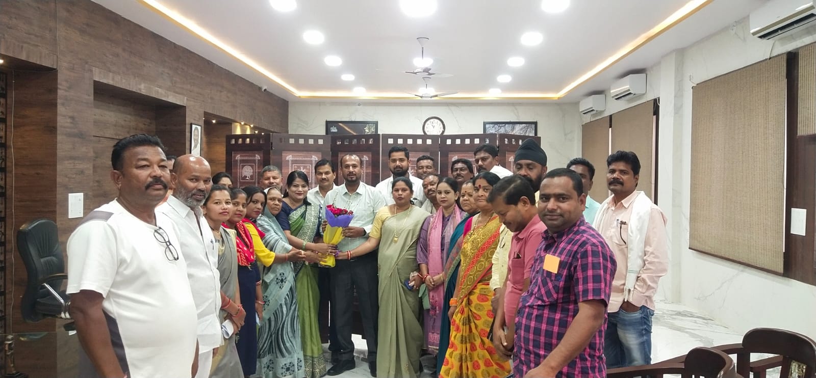 जगदलपुर बस्तर जिले के नवपदस्थ कलेक्टर विजय दयाराम के. से आज जिला कार्यालय में महापौर सफीरा साहू के नेतृत्व में कांग्रेस पार्षदों ने सौजन्य मुलाकात की। महापौर श्रीमती साहू ने कलेक्टर विजय दयाराम के. को बुके भेंटकर उनका सम्मान किया। महापौर और कांग्रेस पार्षदों ने शहर विकास को लेकर चर्चा की। इस दौरान नगर निगम अध्यक्ष कविता साहू ,एमआईसी सदस्य यशवर्धन राव, उदयनाथ जेम्स, विक्रम सिंह डांगी, राजेश राय, कनीज फातिमा, सुषमा कश्यप, सुशीला बघेल, पार्षद सूर्या पाणि, कोमल सेना, ललिता राव, श्वेता बघेल, लता निषाद, कमलेश पाठक, बलराम यादव, सुखराम नाग, नेहा धुव, शुभम यदु, मनोनीत पार्षद अमरसिंह, कौशल नागवंशी, अम्माजी राव, पूर्व पार्षद अब्दुल रशीद, आभास महंती आदि उपस्थित थे। कलेक्टर विजय दयाराम के. से मुलाकात में शहर विकास को लेकर काफी लंबी चर्चा की गई। उन्होंने सभी के सहयोग से शहर को विकास का नया आयाम देने की बात कही।