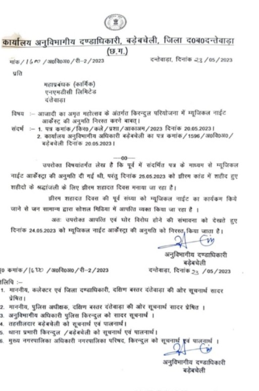 जगदलपुर एनएमडीसी के किरंदुल बैलाडीला काम्प्लेक्स द्वारा आजादी के अमृत महोत्सव के उपलक्ष में 24 मई की संध्या आयोजित म्यूजिकल नाईट कार्यक्रम की अनुमति निरस्त कर दी गई है। यह कार्यक्रम झीरम घाटी शहादत दिवस की पूर्व संध्या होने वाला था। चूंकि झीरम घाटी नरसंहार से जनभावनाएं जुड़ी हुई हैं और इसके ठीक एक दिन पहले गीत संगीत की महफिल सजाए जाने का अंचल में पुरजोर विरोध शुरू हो गया था। इसे ध्यान में रखते हुए इस समाचार पत्र ने आयोजन की टाइमिंग पर सवाल खड़े करते हुए समाचार प्रकाशित किया था। इसके बाद ही प्रशासन ने आयोजन की अनुमति वापस ले ली है। झीरम घाटी में 25 मई को परिवर्तन यात्रा लेकर निकले कांग्रेस नेताओं के काफिले पर नक्सलियों ने हमला कर दिया था। यह हमला सुकमा से निकल कर आगे बढ़ रहे काफिले पर झीरम घाटी में किया गया था। इस हमले में छत्तीसगढ़ कांग्रेस के वरिष्ठ नेता नंद कुमार पटेल, बस्तर टाइगर महेंद्र कर्मा, राजनांदगांव के विधायक उदय मुदालियार समेत अनेक कांग्रेस नेता और सुरक्षा जवान मारे गए थे। तब की छ्ग सरकार ने इन सभी नेताओं और सुरक्षा बलों के जवानों को शहीद का दर्जा दिया था। इस घटना के बाद से कांग्रेस 25 मई को शहादत दिवस के रूप में मनाती आ रही है। इस वर्ष शहीद नेताओं को श्रद्धांजलि देने राज्य के मुख्यमंत्री भूपेश बघेल तथा अनेक मंत्री 24 मई से दो दिवसीय प्रवास पर बस्तर आ रहे हैं। कांग्रेस नेताओं और सुरक्षा बलों के जवानों की शहादत को नजर अंदाज करते हुए एनएमडीसी प्रबंधन ने 24 मई की रात्रि अपने किरंदुल बैलाडीला काम्प्लेक्स में म्यूजिकल नाईट का कार्यक्रम आयोजित करने का फैसला ले लिया था। आयोजन में टीवी के नामी सिंगर्स और प्लेबैक सिंगर्स को मोटी रकम देकर आमंत्रित किया गया था। जिला प्रशासन से अनुमति लेकर आयोजन की पूरी तैयारी भी कर ली गई थी। शहादत दिवस की पूर्व संध्या गीत संगीत की महफिल सजाए जाने की बात जैसे ही सामने आई, इसका पुरजोर विरोध शुरू हो गया। बीजापुर के विधायक विक्रम मंडावी समेत अनेक कांग्रेस नेताओं ने आयोजन पर आपत्ति जताते हुए इसे शहादत का अपमान निरुपित किया था। वहीं सोशल मीडिया यूजर्स ने भी सोशल मीडिया पर विरोध में कड़ी प्रतिक्रियाएं देना शुरू कर दी थी। जनभावनाओं को देखते हुए इस समाचार पत्र ने आयोजन की टाइमिंग पर सवाल उठाते हुए विस्तृत समाचार प्रकाशित किया था। इसका असर यह हुआ कि बड़े बचेली के एसडीएम ने म्यूजिकल नाईट के लिए दी गई प्रशासनिक अनुमति को निरस्त कर दिया है।