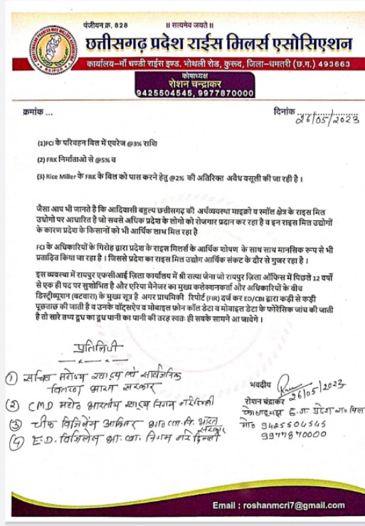 - छ्ग राईस मिलर्स एसोसिएशन कोषाध्यक्ष चंद्राकर ने की शिकायत