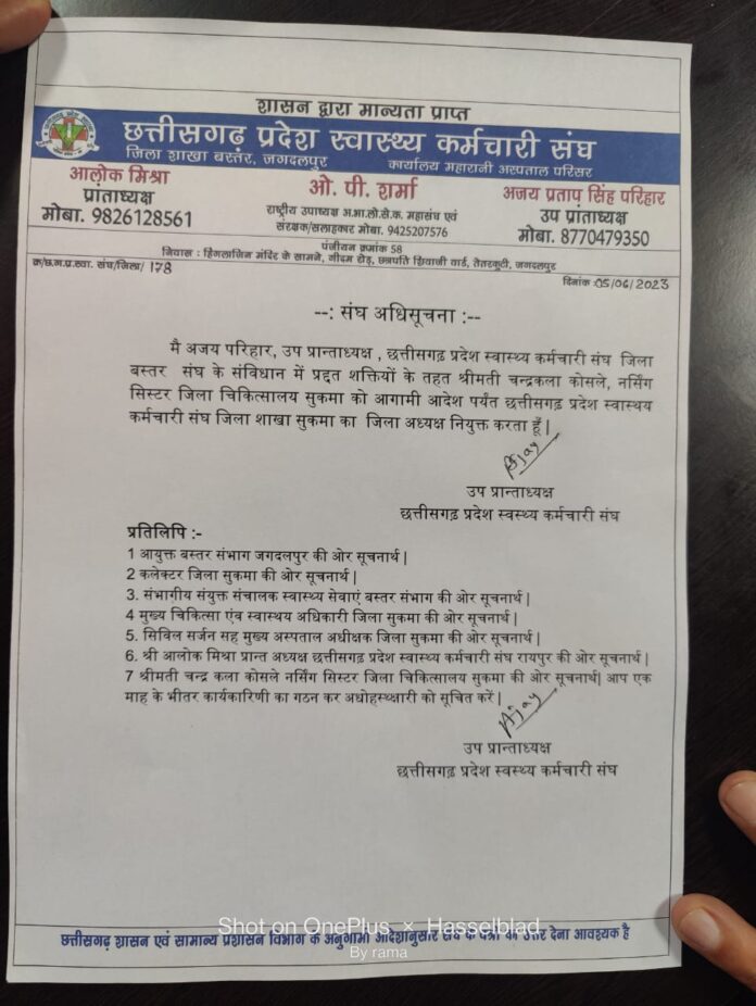 जगदलपुर छत्तीसगढ़ प्रदेश स्वास्थ्य कर्मचारी संघ की सुकमा जिला इकाई अध्यक्ष पद पर जिला चिकित्सालय की नर्सिंग स्टॉफ चंद्रकला कोसले की नियुक्ति की गई है। चंद्रकला की नियुक्ति संघ के प्रदेश अध्यक्ष आलोक मिश्रा की सहमति से उप प्रांताध्यक्ष अजय प्रताप सिंह परिहार ने की है। श्रीमती कोसले को जिलाध्यक्ष बनाए जाने की सूचना विभाग के सभी वरिष्ठ अधिकारियों को प्रेषित की गई है। चंद्रकला की नियुक्ति पर सुकमा जिले के विभागीय कर्मचारियों ने खुशी व्यक्त करते हुए उन्हें बधाई दी है।