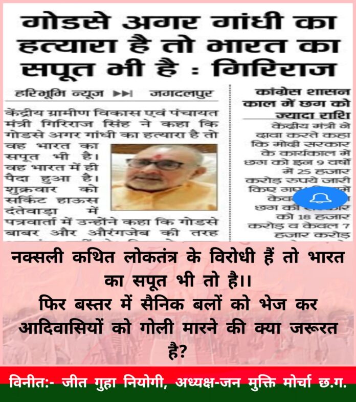 दल्लीराजहरा केंद्रीय मंत्री गिरिराज सिंह ने बस्तर की धरती से एक बड़े विवाद को जन्म देकर भाजपा की मुश्किल बढ़ा दी है। उन्होंने कहा दिया कि गोडसे अगर गांधी का हत्यारा है तो भारत का सपूत भी है। कांग्रेस अपने स्तर पर जवाब दे रही है। लेकिन यहां जन मुक्ति मोर्चा के अध्यक्ष जीत गुहा नियोगी ने केंद्रीय मंत्री की इस विवादास्पद टिप्पणी को नक्सलियों से जोड़ कर एक नया मोड़ दे दिया है। विश्व विख्यात श्रमिक नेता शंकरगुहा नियोगी के पुत्र जनमुक्ति मोर्चा अध्यक्ष जीत ने सोशल मीडिया पर सवाल उठाया है कि नक्सली कथित लोकतंत्र के विरोधी हैं तो भारत का सपूत भी तो हैं। फिर बस्तर में सैनिक बलों को को भेज कर आदिवासियों को गोली मारने की क्या जरूरत है। गिरिराज सिंह की टिप्पणी पर भड़की कांग्रेस गोडसे को आजाद भारत का पहला आतंकवादी बता रही है। भाजपा और कांग्रेस की राजनीतिक लड़ाई अपनी जगह है लेकिन जीत गुहा नियोगी ने जो सामाजिक सवाल उठाया है, उसका जवाब बहुत मुश्किल है। वैसे प्रदेश कांग्रेस मीडिया प्रमुख सुशील आनंद शुक्ला ने नाथूराम गोडसे को आजाद भारत का पहला आतंकवादी करार दिया है। केंद्रीय मंत्री गिरिराज सिंह ने गोडसे को देश का सपूत बताया था। कांग्रेस संचार विभाग के अध्यक्ष सुशील शुक्ला ने कहा कि केंद्रीय मंत्री ने गोडसे का महिमामंडन कर के एक बार फिर से राष्ट्रपिता का अपमान किया है। यह भाजपा का गोडसे वादी चरित्र है। भाजपा के हर छोटे बड़े नेता ने कभी न कभी गोडसे की तारीफ की है। यह सिर्फ बापू का नहीं, भारत की जनता का अपमान है। प्रधानमंत्री जवाब दें कि वे अपने मंत्री के बयान से कितने सहमत हैं। कांग्रेस कह रही है कि भाजपा मुद्दाविहीन है। आरएसएस के नेता खुद पादरी बन कर धर्मान्तरण की नौटंकी करते हैं। फिर भाजपा के नेता उसी को मुद्दा बना कर बयान देते हैं। गिरिराज जैसे नेता बुला कर मामले को तूल दिया जाता है।लोगों में भ्र्म पैदा किया जाता है।छत्तीसगढ़ में धर्मान्तरण विरोधी क़ानून लागू है तो भाजपाई थाने मे रिपोर्ट दर्ज क्यों नहीं कराते। वे खुद इसमें शामिल हैं तो रिपोर्ट कैसे करेंगे। कांग्रेस को तो भाजपा एक सवाल के जवाब में तीन सवाल भेज देती है लेकिन जनमुक्ति मोर्चा का सवाल इतना संवेदनशील है कि सवाल के जवाब में सवाल नहीं चलने वाले।