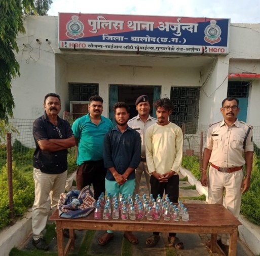 इसी प्रकार अवैध शराब परिहन पर नकेल कसते हुए मुखबीर की सूचना पर दिनांक 10.06.2023 को राजनांदगांव निवासी 01. जुग्गा ढीमर पिता शंकर ढीमर उम्र 22 वर्ष साकिन लखोली स्कुल के पास लखोली थाना सिटी कोतवाली जिला राजनांदगांव 02. दुष्यंत साहू पिता हरिशंकर साहू उम्र 22 वर्ष साकिन सुरगी थाना सुरगी जिला राजनांदगांव छ0ग0 के द्वारा अवैध रूप से अर्जुन्दा के भैंस खटाल के पीछे, पुराना तहसील कार्यालय के पास अधिक मात्र में देशी प्लेन शराब परिवहन कर रहा था जिसे घेराबंदी कर पकड़ा गया। जिसे पुछताछ किया गया, जिसके कब्जे से कुल 63 नग पौव्वा देशी प्लेन शराब जिसकी कीमती कुल 5040 रूपये व एक नग पुरानी इस्तेमाली स्कुटी होण्डा एक्टीवा सफेद कलर क्र0 CG 08 AB0351 कीमती करीबन 25000 रू0 को तलाशी उपरांत बरामद किये जिसे मौके पर जप्ती कार्यवाही की गई है। आरोपी 01. जुग्गा ढीमर 02. दुष्यंत साहू के द्वारा धारा-34(2) आब.एक्ट का घटित करना पाये जाने से दिनांक 10.06.2023 के 13/10, 13/15 बजे गिरफ्तार कर हिरासत में लेकर थाना लाया गया। जिसे आज दिनांक 10.06.2023 के माननीय न्यायालय के समक्ष रिमांड पर भेजा गया है। इस कार्यवाही में सउनि रमेश सिन्हा, आर0 1943, त्रवेश सिन्हा व आर0क्र0 244 पिताम्बर ठाकुर का महत्तवपूर्ण योगदान रहा