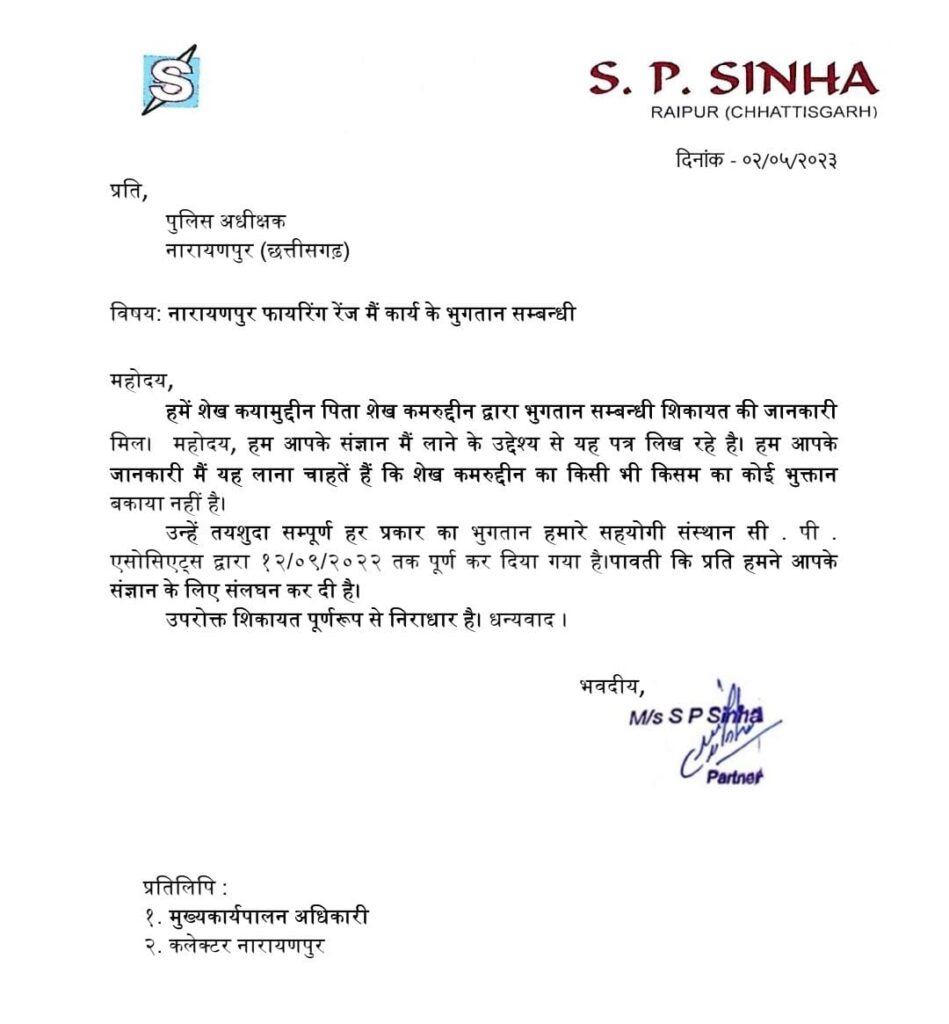 नारायणपुर बस्तर संभाग में नक्सली समस्या की आड़ में बाहरी बड़े ठेकेदारों को स्थानीय छोटे ठेकेदार किस कदर परेशान करते हैं, इसका एक उदाहरण नारायणपुर में सामने आया है। नारायणपुर जिले के तेलसी में पुलिस विभाग के लिए फायरिंग रेंज निर्माण का ठेका रायपुर के मेमर्स एसपी सिन्हा (मनोज सिन्हा) द्वारा लिया गया था। मेमर्स एसपी सिन्हा ने उस कार्य को वहां के लोकल पेटी ठेकेदार शेख कयामुद्दीन को दे दिया। कार्य के एवज में जितने पैसों के भुगतान की बात हुई थी, उसका पूर्ण भुगतान मेमर्स एसपी सिन्हा द्वारा कर दिया गया। इसकी पावती उनके पास उपलब्ध है।