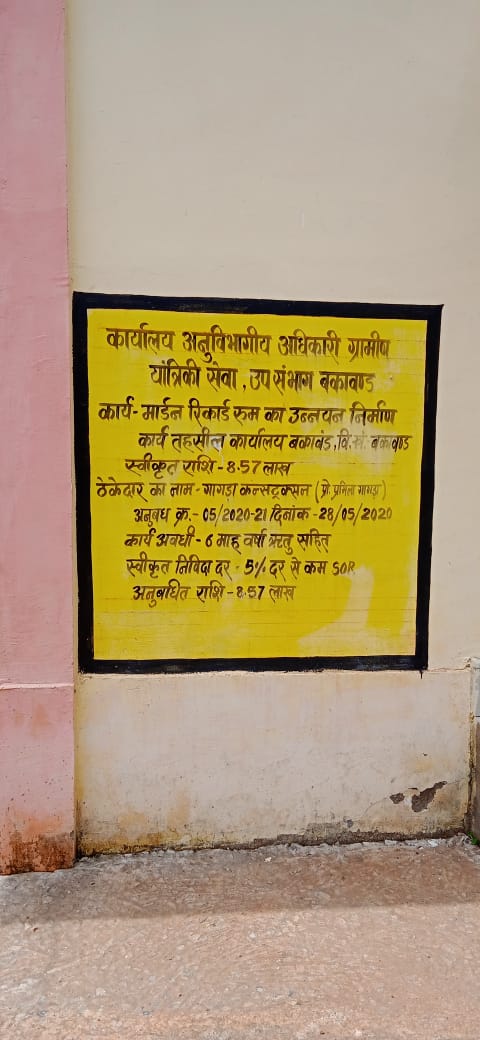 बकावंड तहसील कार्यालय के रिकॉर्ड रूम के नवनिर्माण एवं उन्नयन कार्य में गड़बड़ी और भ्रष्टाचार का रिकॉर्ड बना दिया गया है। भवन की दीवारें दरक गईं हैं, फ्लोरिंग उखड़ रही है और खिड़की, दरवाजे भी जवाब देने लगे हैं। ग्रामीण यांत्रिकी सेवा विभाग (आरईएस) ने यह कार्य ठेका एजेंसी गागड़ा कंस्ट्रक्शन कंपनी के जरिए करवाया है। इस फर्म ने तय समय सीमा में कार्य पूर्ण करवाया नहीं फिर भी आरईएस की ओर से उसे पूर्ण भुगतान कर दिया गया है। ग्रामीण यांत्रिकी सेवा विभाग ने तहसील कार्यालय बकावंड के रिकॉर्ड रूम उन्नयन एवं निर्माण के लिए 8 लाख 57 हजार रुपए स्वीकृत कर यह कार्य गागड़ा कंस्ट्रक्शन कंपनी को ठेके पर दिया था। इस ठेका कंपनी ने उन्नयन व निर्माण के नाम पर पुराने रिकॉर्ड रूम का मामूली मरम्मत, रंग रोगन, इलेक्ट्रीफिकेशन आदि कार्य कराकर बिल, व्हाउचर नव निर्माण का प्रस्तुत किया और पूरी रकम विभाग से प्राप्त कर ली। कार्य की गुणवत्ता की कलई अब खुलने लगी है। दीवारें फट गई हैं, प्लींथ और फ्लोरिंग उधड़ चुकी है। दीवारों के करीब फटी प्लींथ और फ्लोरिंग निर्माण में बरती गई अनियमितता की चुगली कर रही हैं। विद्युतीकरण का कार्य भी स्तरहीन कराया गया है। हल्के दर्जे के स्वीच बोर्ड व अन्य सामान लगाए गए हैं, वायरिंग भी घटिया है। दीवारें काफी चौड़ाई में लगातार फटती चली जा रही हैं। दरकी दीवारों से बरसाती पानी का रिसाव होने लगा है। जो परेशानियां इस रिकॉर्ड रूम में पहले से रही हैं, वह उन्नयन व नए सिरे से निर्माण के बाद भी दूर नहीं हो पाई हैं।