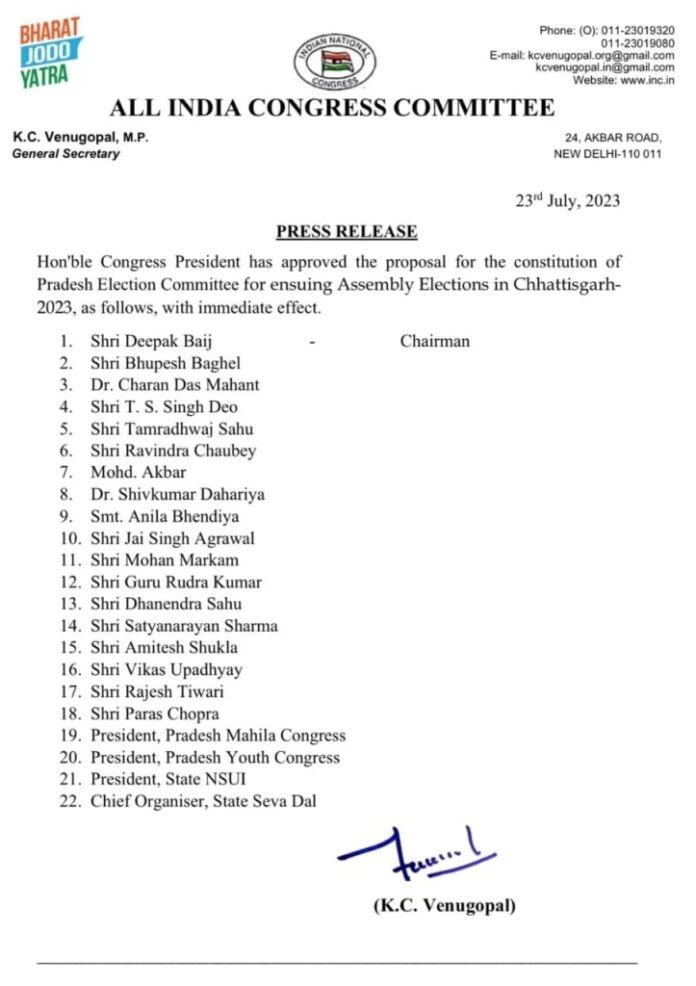 जगदलपुर छत्तीसगढ़ विधानसभा के चुनावों के लिए कांग्रेस के चुनाव समिति की घोषणा कर दी गई है। समिति में बस्तर के कद्दावर नेता कवासी लखमा को जगह नहीं मिली है। इसे लेकर संभाग तरह तरह की चर्चा हो रही है।कांग्रेस के राष्ट्रीय अध्यक्ष ने छत्तीसगढ़ में आगामी विधानसभा चुनाव के लिए प्रदेश चुनाव समिति के गठन के प्रस्ताव को मंजूरी दे दी है। समिति में प्रदेश कांग्रेस अध्यक्ष दीपक बैज, मुख्यमंत्री भूपेश बघेल, उप मुख्यमंत्री टीएस सिंहदेव, 9 मंत्रियों समेत कुल 22 नेताओं को शामिल किया गया है। आबकारी एवं उद्योग मंत्री कवासी लखमा को बस्तर संभाग के सुकमा में कांग्रेस का अपराजेय योद्धा माना जाता है। बावजूद पार्टी की चुनाव समिति में उन्हें नहीं रखा गया है। इसे लेकर तरह तरह की चर्चा है। विधानसभा चुनाव हेतु टिकट वितरण में इस समिति की अहम भूमिका रहेगी। श्री लखमा के अलावा उमेश पटेल और अमरजीत भगत को भी समिति से बाहर रखा गया है। कांग्रेसी सियासत के बड़े जानकार भी इसे लेकर हैरत में हैं और कुछ भी कह पाने की स्थिति में नहीं हैं। उनके समझ में यह बात नहीं आ रही है कि किस रणनीति के तहत अपने अपने क्षेत्र के इन दिग्गजों को चुनाव समिति में अहमियत नहीं दी गई है।
