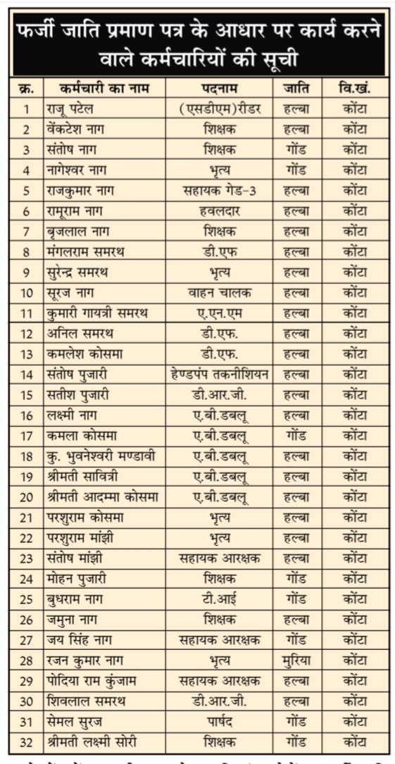 ज्ञातव्य हो कि सुकमा जिले के कोंटा इलाके में फर्जी जाति प्रमाण पत्रों के सहारे आदिवासियों केलिए आरक्षित सीटों पर 36 गैर आदिवासियों ने कब्जा जमा रखा है। इनमें स्वास्थ्य विभाग, शिक्षा विभाग, पुलिस विभाग के कर्मचारी शामिल हैं। सर्वाधिक संख्या में कोंटा तहसील के लोगों ने फर्जी प्रमाण पत्र के सहारे नौकरी पाई है। अब इनकी नौकरी पर खतरा मंडरा रहा है।
