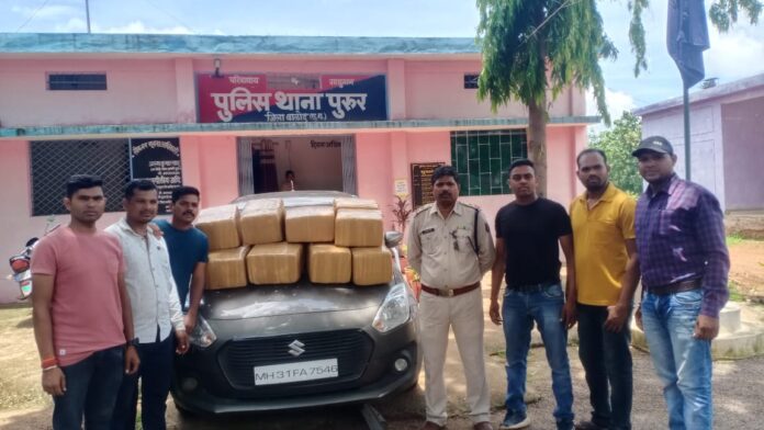 बालोद थाना पुरूर मिली एक और बड़ी सफलता थाना पुरूर पुलिस द्वारा मादक पदार्थ परिवहन पर बड़ी कार्यवाही घटना में प्रयुक्त प्रयुक्त वाहन मारुति स्पीट कार का रंग ग्रे कमांक MH-31-FA-7546 कीमती 7,00,000/० एवं मादक पदार्थ गांजा कुल वजनी 1क्विंटल 37 किलो किंमती 13.70,000/ वाहन सहित जुमला कीमती 20.70.000/रुपये को किया गया जप्त 2- आरोपी वाहन चालक फरार अवैध गांजा की तस्करी के रोकथाम हेतु पुलिस महानिरीक्षक दुर्ग रेल दुर्ग आनंद छाबड़ा के निर्देश प्राप्त होने पर पुलिस अधीक्षक महोदय बालोद जितेन्द्र यादव, अतिरिक्त पुलिस अधीक्षक महोदय कुमार नामक के मार्गदर्शन में पुलिस अनुविभागीय अधिकारी गुरुर जिला बालोद बोनीफास एक्का के प्रभारी पुलिस थाना पुर उप. निरीक्षक अरुण कुमार साहू के नेतृत्व में धानापुर पुलिस की टीम को अवैध मादक पदार्थ गांजा के परिवहन संबंधी प्रकरण मे बड़ी सफलता हासिल की गई। दिनांक 25.07.2023 को मुखबीर से सुचना प्राप्त हुआ कि एक मारुती स्वीट कार कमांक MH-31-FA-7546 के चालक द्वारा अवैध मादक पदार्थ गाजा रखकर उडिसा से महाराष्ट्र की ओर आ रही है कि सूचना पर उप निरीक्षक अरुण कुमार साहू के हमराह पुलिस स्टाफ के पुलिस थाना पुरूर के सामने एन एवं 30 मार्ग पर रवाना होकर वाहनों की चेकिंग कार्यवाही की जा रही थी बाद मुखबीर से सूचना मिला कि राजाराव पठार के जंगल अंदर एक मारुती स्वीट कार कमांक MH-31-FA-7546 को छोड़कर भाग गया है सूचना पर मौके पर जाकर विधिवत् कार्यवाही कर वाहन की तलाशी लेने पर मारुती स्वीप्ट कार कमांक MH- 31-FA-7546 के पीछे सीट एवं वाहन की डिक्की में कुल 13 पैकेट मादक पदार्थ गांजा कुल वजनी 1 क्विंटल 37 किलो किमती 13.70,000/ रू० वाहन सहित जुमला कीमती 20.70.000/रुपये जप्त कर कब्जा पुलिस लिया गया एवं फरार आरोपी के विरुद्ध अपराध धारा 20) एनडीपीएस एक्ट का अपराध कायम कर कार्यवाही में लिया गया।उक्त प्रकरण में पुलिस थाना पुरूर प्रभारी उप निरीक्षक अरुण कुमार साहू आरक्षक लिखन साहू किशोर साहू, गुणेश यादव, छोटू सोनकर, उमाशंकर जारके, संदीप यादव, जितेन्द्र सिन्हा, डोमेन्द्र कुमार रावटे की सराहनीय भूमिका रही।