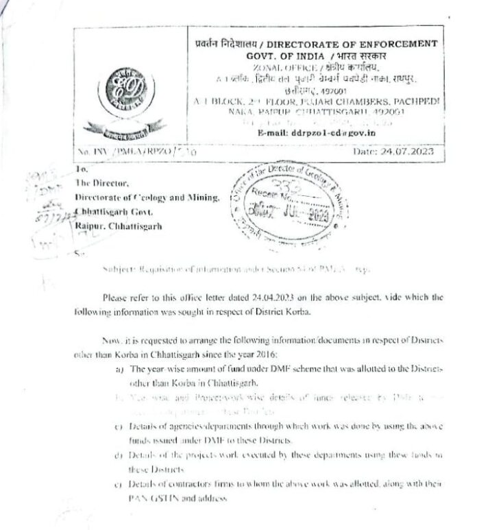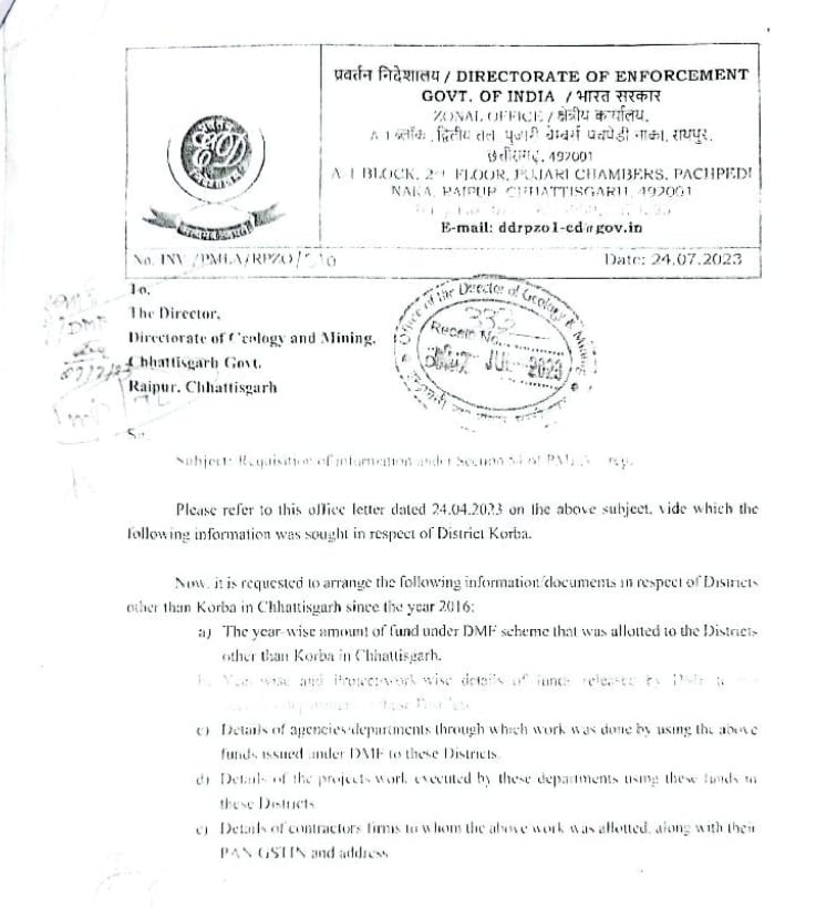 ईडी ने जिन बिंदुओं पर जानकारी मांगी है, उनमें प्रमुख हैं जिलों में डीएमएफ से कितनी राशि जारी की गई है विभागों और एजेंसियों को इसकी वर्षवार जानकारी उपलब्ध कराएं, जिलों द्वारा इस फंड से जिन विभागों, एजेंटों से कार्य करवाया गया है उन विभागों व ठेकेदारों के नाम उन फर्मों के नाम और उनके पेन नंबर जीएसटी नंबर उपलब्ध करवाएं। सूत्रों के अनुसार डीएमएफ फंड का छत्तीसगढ़ सरकार ने जो 6583 करोड़ रुपए खर्च किए हैं, इसमें सबसे ज्यादा राशि कोरबा जिले के हिस्से में गई है। कोरबा जिले में डीएमएफटी मद से 1246 करोड़ रुपए खर्च किए गए हैं। दूसरे नंबर पर बस्तर संभाग के दंतेवाड़ा जिला है, जहां 8753 रुपए इस फंड से खर्च किए गए हैं।