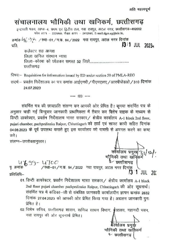 जगदलपुर ईडी द्वारा चाही गई जानकारी देने में भौमिकी एवं खनिज विभाग के डायरेक्टर की पहल पर सभी जिला कलेक्टरों ने तत्परता दिखाई है। ईडी के अचानक उठाए गए कदम से प्रशासन तंत्र, ठेकेदारों और सप्लायर्स में हड़कंप मच गया है। ईडी के क्षेत्रीय कार्यालय ने संचालक भौमिकी एवं खनिज विभाग छ्ग शासन को पत्र भेजकर जिला खनिज न्यास ट्रस्ट की राशि के आवंटन, खर्च, ठेकेदारों, सप्लायर्स का ब्यौरा मांगा है। ईडी को विस्तृत जानकारी उपलब्ध कराने की अंतिम तिथि 4 अगस्त थी। जिस दिन से खनिज विभाग के संचालनलय से इस आशय का परिपत्र जिला खनिज न्यास ट्रस्ट के अध्यक्ष सह कलेक्टरों को जारी हुआ है, तभी से सभी जिला कार्यालयों में हड़कंप के हालात हैं। आनन फानन में सारे पुराने रिकॉर्ड खंगालकर जानकारी संग्रहित की जाने लगी थी।