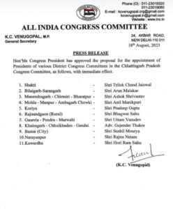 प्रदेश कांग्रेस अध्यक्ष दीपक बैज की अनुशंसा पर अभा कांग्रेस कमेटी ने छत्तीसगढ़ के नए जिलों समेत बस्तर शहर सहित अन्य जिलों के रिक्त अध्यक्ष पदों पर नियुक्ति आदेश जारी किया है। पार्टी के राष्ट्रीय महासचिव केसी वेणुगोपाल के हस्ताक्षर से जारी आदेश में बस्तर जिला शहर कांग्रेस कमेटी के अध्यक्ष पद पर सांसद दीपक बैज के जिला प्रतिनिधि सुशील मौर्य की नियुक्ति की है। यह पद राजीव शर्मा के इस्तीफे के बाद रिक्त हुआ था। युवा और तेज तर्रार तथा कर्मठ नेता को शहर जिला अध्यक्ष बनाया जाना कांग्रेस के लिए बड़ा ही लाभकारी होगा। मौर्य लंबे समय से भाजपा के खिलाफ आक्रामक तेवर दिखाते आए हैं। वे पार्टी के कार्यक्रमों में सक्रिय भागीदारी देते रहते हैं। उनकी नियुक्ति से जगदलपुर के कार्यकर्त्ताओं में खुशी की लहर दौड़ गई है। कार्यकर्त्ताओं यहां स्थित कांग्रेस कार्यालय और मौर्य के निवास के समक्ष जमकर आतिशबाजी की और मिठाईयां बांटी। कार्यकर्त्ता भूपेश बघेल, दीपक बैज और सुशील मौर्य जिंदाबाद के नारे लगाते रहे। सुशील मौर्य की नियुक्ति पर विधायक रेखचंद जैन, सांसद दीपक बैज के सोशल मीडिया प्रभारी एवं शहर जिला युवा कांग्रेस के महासचिव अनुराग महतो समेत अनेक नेताओं ने खुशी जताते हुए उन्हें बधाई एवं शुभकामनाएं दी हैं। सुशील मौर्य ने कहा है कि पार्टी ने जिस उम्मीद के साथ उन्हें यह दायित्व सौंपा है, उस पर वे सौ फीसदी खरा उतरने का भरसक प्रयास करेंगे।