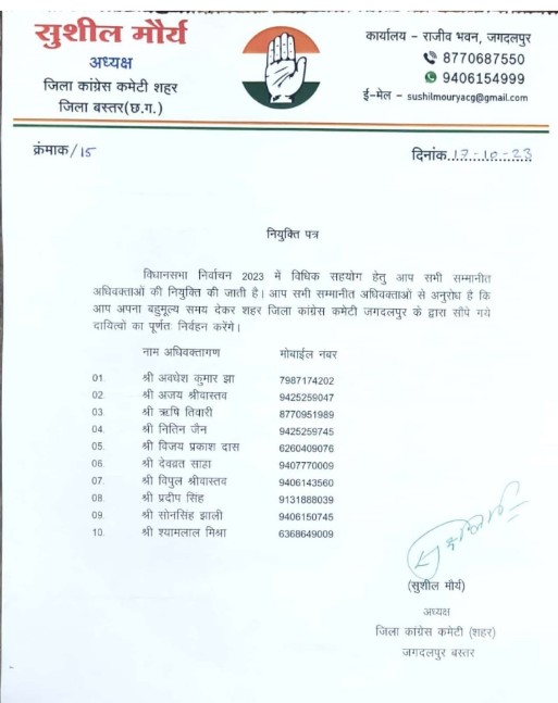 जगदलपुर चुनाव के दौरान कांग्रेस की कानूनी मदद करने के लिए दस वकीलों की टीम तैयार की गई है। शहर जिला कांग्रेस कमेटी के अध्यक्ष सुशील मौर्य ने वकीलों की यह टीम बनाई है। वकीलों के नाम व उनके सेलफोन नंबर भी मौर्य ने जारी किए हैं।