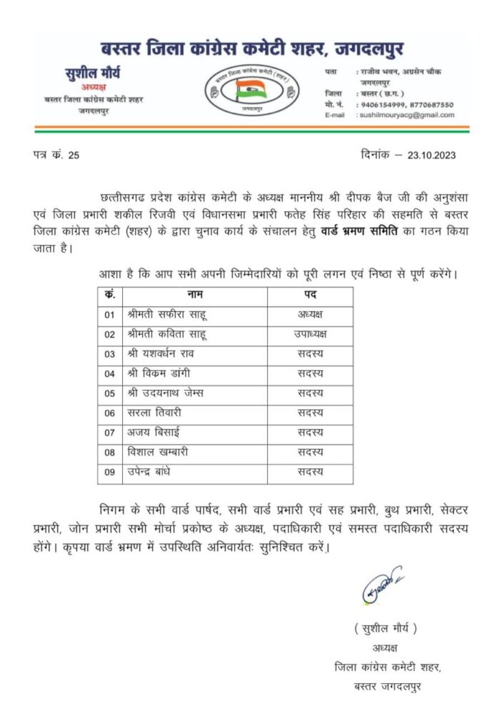 जगदलपुर प्रदेश कांग्रेस अध्यक्ष दीपक बैज के निर्देश पर एवं जिला प्रभारी शकील रिजवी व विधानसभा क्षेत्र प्रभारी फतेह सिंह परिहार की सहमति से शहर जिला कांग्रेस कमेटी के अध्यक्ष सुशील मौर्य ने विधानसभा चुनाव के लिए वार्ड भ्रमण समिति गठित कर दी है। समिति की अध्यक्ष महापौर सफीरा साहू, उपाध्यक्ष नगर निगम सभापति कविता साहू, सदस्य यशवर्धन राव, विक्रम सिंह डांगी, उदयनाथ जेम्स, सरला तिवारी, अजय बिसाई, विशाल खंबारी व उपेंद्र बांधे मनोनीत किए गए हैं। यह समिति नगर के सभी वार्डों में कांग्रेस प्रत्याशी जतिन जायसवाल के पक्ष में जनसंपर्क करेगी। सुशील मौर्य ने सभी वार्डों के प्रभारियों व सह प्रभारियों तथा कांग्रेस कार्यकर्त्ताओं से दौरे में अनिवार्य रूप से उपस्थित रहने के लिए कहा है।
