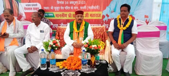 दल्लीराजहरा उत्तराखंड के अध्यात्मिक गुरु व कैबिनेट मंत्री श्रद्धेय सतपाल महाराज जी ने भूपेश सरकार पर भ्रष्टाचार का आरोप लगाते हुए कहा यह कांग्रेस सरकार शराब घोटाला चावल घोटाला पी एस सी घोटाला जैसे अनेक घोटालों से घिरी हुई सरकार है अब समय आ गया है कांग्रेस सरकार को हटाने के लिए तैयार रहें और प्रदेश में डबल इंजन की लाकर प्रधानमंत्री नरेन्द्र मोदी के विकास कार्यों से छत्तीसगढ़ को विकसित राज्य बनाने में आप सभी कमल पर बटन दबाकर डौंडीलोहारा विधानसभा क्षेत्र से प्रत्याशी देवलाल ठाकुर को विजय दिलाने में अहम भूमिका निभाऐ इस अवसर पर विधानसभा प्रभारी राजेश ताम्रकार बालोद जिला भाजपा अध्यक्ष कृष्णकांत पवार विधानसभा संयोजक देवेंद्र जायसवाल सहित हजारों की संख्या में धर्मगुरु श्रद्धेय सतपाल महाराज जी के अनुयायी उपस्थित थे|