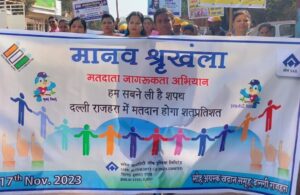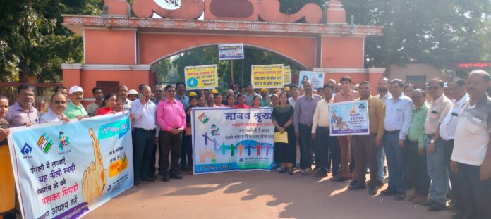 जिला निर्वाचन अधिकारी कलेक्टर बालोद के निर्देशानुसार लौह अयस्क समूह भिलाई इस्पात संयंत्र के कार्मिक विभाग के नेतृत्व में 17 नवंबर 2023 को होने वाले द्वितीय चरण के विधानसभा चुनाव में आधिकारिक मतदान करने मतदाता जागरूकता हेतु मानव श्रृंखला बनाई गई l आम जनता से अपील की गई कि स्वयं अपने परिवार मित्रों सभी को मतदान करने जाने के लिए प्रेरित करें l कार्यक्रम में प्रमुख रूप से नगर पालिका अधिकारी श्रीमती शीतल चंद्रवंशी महाप्रबंधक महामाया अरुण कुमार महाप्रबंधक अमित सिन्हा महाप्रबंधक संविदा चंद्र भूषण महाप्रबंधन प्रशिक्षण सत्येंद्र कुमार सहायक महाप्रबंधक क्रमिक एम डी रेड्डी विपिन कुमार विधानसभा चुनाव के लिए अधिकृत बीएसपी के नोडल अधिकारी नितेश क्षत्री सहायक प्रबंधक कार्मिक श्री जय सिह बघेल नगर प्रशासक मंगेश सर श्रीजोत कुमार सिकंदर इंदौरिया एवं श्रमिक संगठन के प्रमुख कामरेड प्रकाश सिंह क्षत्रिय कामरेड पुरुषोत्तम सिमैया कामरेड राजेंद्र बेहरा नगर प्रशासक विभाग से प्रबंधक रमेश हेडऊ शैलेंद्र व्यास समीर चौबे एवं विभिन्न कर्मचारी और अधिकारी उपस्थित थे ।