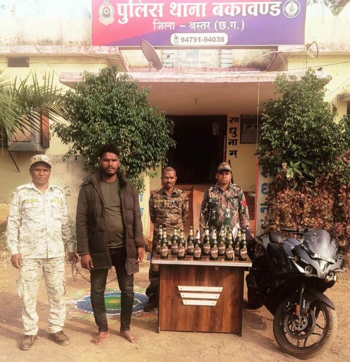 एसएसपी एवं एएसपी के दिशा निर्देश पर अनुविभागीय पुलिस अधिकारी भानपुरी घनश्याम कामड़े के सुपरविजन में 24 नवंबर को ओडिसा से एक बिना नंबर की पल्सर मोटर सायकल में अवैधअंग्रेजी शराब को छुपाकर छत्तीसगढ़ में खपाने के लिए ला रहे युवक को बकावंड थाना प्रभारी निरीक्षक दिनेश कुमार यादव ने अपनी टीम के साथ नलपावंड नाका पर नाकाबंदी कर पकड़ा। जब संदिग्ध बाईक को रूकवाने का प्रयास किया गया तो चालक ने गाड़ी सहित भागने का प्रयास किया। पुलिस के जवानों ने उसे दौड़ाकर पकड़ लिया।संदिग्ध व्यक्ति ने पूछताछ करने पर अपना नाम बलिराम कश्यप पिता कुमोराम कश्यप उम्र 30 वर्ष, निवासी किंजोली थाना बकावंड बताया। तलाशी लेने पर उसके कब्जे से ओड़िशा निर्मित हंटर बियर की 12 बोतलों की पेटी बरामद की गई। बियर की कीमत रुपया 1800 रु बताई गई है। इसके अलावा नगद रकम 3050 रुपए भी उसके पास से मिली। बियर, रकम और मोटर सायकल को जप्त कर आरोपी को गिरफ्तार कर लिया गया। आरोपी को न्यायालय भेजकर न्यायिक रिमांड पर जेल दाखिल किया गया। आरोपी को पकड़ने में निरीक्षक दिनेश कुमार यादव, प्रधान आरक्षक मोहन कश्यप, नीलाधर बघेल, आरक्षक बलिराम भारती, भोलाराम बघेल, जगतराम कश्यप, राहुल नेताम की भूमिका सराहनीय रही।