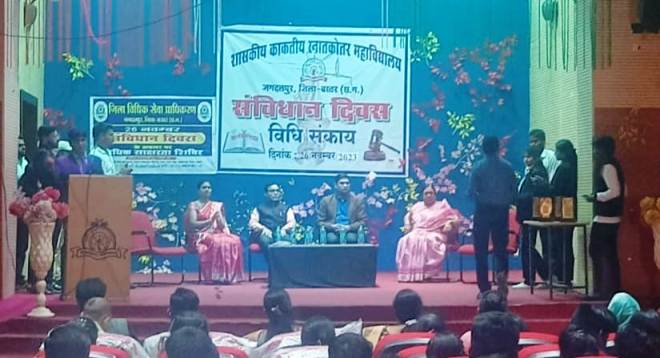 उन्होंने संविधान में प्रदत्त अधिकारों पर रौशनी डालते हुए कहा कि संवैधानिक दायरे में रहकर तथा संविधान का पालन करते हुए ही अधिकारों को हासिल किया जा सकता है। उन्होंने विद्यार्थियों को विधिक सेवा योजनाओं की भी जानकारी दी। जगदलपुर के मुख्य न्यायिक मजिस्ट्रेट रुपनारायण पठारे ने विद्यार्थियों को संवैधानिक अधिकारों की विस्तृत जानकारी देते हुए उन्हें विधिक सेवा प्राधिकरण की योजनाओं के व्यापक प्रचार प्रसार करने के लिए प्रेरित किया। उन्होंने कहा कि अब न्याय पाने में गरीबी बाधक नहीं है। द्वितीय व्यवहार न्यायाधीश वर्ग -1 अनिता ध्रुव ने विद्यार्थियों को संविधान, राष्ट्र की एकता, अखंडता, संप्रभुता की रक्षा व संवैधानिक मूल्यों के पालन के लिए प्रेरित करते हुए मूलभूत अधिकारों और मौलिक कर्तव्यों की जानकारी दी। कॉलेज की प्राचार्य डॉ. के. इंदिरा ने संविधान में प्रदत्त अधिकारों पर प्रकाश डालते हुए सभी नागरिकों को उन अधिकारों से अवगत कराने पर जोर दिया। इस दौरान विधि के छात्र छात्राओं ने गौर नृत्य की प्रस्तुति दी। इस अवसर पर कॉलेज के विधि विभाग के प्राध्यापक मोहन सोलंकी, सभी प्राध्यापक, विधिक सेवा प्राधिकरण के कर्मचारी मुंदीप्रसाद जोशी, चुन्नीलाल पाणिग्रही, पैरा लीगल वॉलिंटियर्स जगन्नाथ भारती एवं कॉलेज के विद्यार्थी उपस्थित थे।