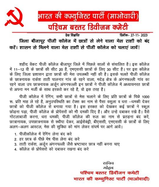 नक्सली संगठन अब तक शासन, प्रशासन, पुलिस, सुरक्षा बलों, ठेकेदारों, निजी माल वाहक गाड़ियों, यात्री बसों, रेलवे लाईनों, निर्माण एजेंसियों आदि को ही टारगेट करते रहे हैं। वनवासियों और आदिवासियों के अधिकारों और जल, जंगल, जमीन की तथाकथित रक्षा की बात करते रहे हैं। इन सबकी आड़ लेकर वे सैकड़ों दफे खून की होली खेल चुके और अरबों खरबों की संपत्ति को नुकसान पहुंचा चुके हैं। छत्तीसगढ़ में इस तरह की घटनाएं अब नई बात नहीं रह गई हैं। यहां के लोग इन सबके अभ्यस्त भी हो चुके हैं। मगर इस सोमवार को नक्सलियों ने एक नया और अप्रत्याशित फरमान जारी कर दिया, जो बस्तर संभाग के साथ ही समूचे छत्तीसगढ़ और देश में भी खलबली मचाने वाला है। दरअसल यह मामला बस्तर संभाग के जिला मुख्यालय बीजापुर केएक कॉलेज से जुड़ा हुआ है। बीजापुर में संचालित शहीद वेंकट शासकीय स्नात्तकोत्तर महाविद्यालय बीजापुर से जुड़े कुछ तथाकथित मसलों को लेकर माओवादी संगठन भारत की काम्युनिस्ट पार्टी (माओवादी) की पश्चिम बस्तर डिवीजन कमेटी के सचिव मोहन ने संगठन के लेटरहेड में कंप्यूटर से प्रिंटेड पत्र जारी किया है। इस पत्र में लिखा है कि बीजापुर महाविद्यालय में छात्रों से ली जाने वाली मेस राशि की वसूली बंद कर शासन से मिलने वाली राशि मेस राशि से पीजी कालेज का मेस चलाया जाए, कॉलेज के रूल्स के नाम पर छात्र छात्राओं को प्रताड़ित करना, घोटालेबाजी करना बंद किया जाए। कहने को तो यह नक्सली संगठन की प्रेस विज्ञप्ति है, लेकिन उसमें जिस भाषा का इस्तेमाल किया गया है, उसे देखते हुए यह एक कड़ा फरमान लगता है। कथित विज्ञप्ति में कहा गया है कि शहीद वेंकट पीजी कालेज बीजापुर जिले में पिछले कई सालों से संचालित है। इस कालेज के हास्टल में हायर सेकंडरी स्कूल की 11वीं व 12वीं के छात्रों की सीट 20 है, एमएससी छात्रों के लिए 30 सीट स्वीकृत है। इस कालेज के लिए जिला प्रशासन द्वारा छात्रों के लिए मेस की सुविधा उपलब्ध नहीं कराई गई है। इसके चलते कॉलेज के छात्र नायक राकेश ताती पालनार गांव व मद्देड़ क्षेत्र के अंगनपल्ली गांव के रहने वाले उप छात्र नायक अर्जुन अंगनपल्ली पीजी कॉलेज में अध्ययनरत छात्र- छात्राओं पर अपनी मर्जी थोपते हुए बेजा हरकतें कर रहे हैं। इस कॉलेज में रेगिंग की जाती है, मेस चलाने हर छात्र से 1000 रू. की वसूली प्रतिमाह की जा रही है, अनुपस्थिति टैक्स के नाम से पैसा वसूला जा रहा है और व डरा – धमकाकर छात्रों को पीजी कॉलेज से भगाया जा रहा है। इस हरकत से परेशान होकर कई छात्रों को स्कूल कॉलेज छोड़ना पड़ा है। पीजी कॉलेज के प्रोफेसरों को भी धमकी दी जाती है और उन्हें दबाकर रखा जाता है। घोटालेबाजी करना, डराना धमकाना, पीजी कालेज के रूल के नाम से प्रताड़ना बंद किया जाए, छात्रा नायक और उप छ