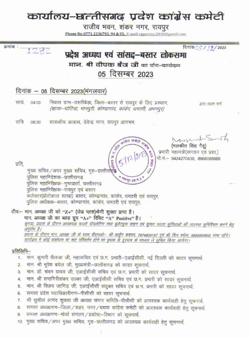 जगदलपुर प्रदेश कांग्रेस अध्यक्ष एवं बस्तर लोकसभा क्षेत्र के सांसद दीपक बैज 6 दिसंबर से रायपुर में रहकर पार्टी की गतिविधियों व बैठकों में भाग लेंगे। प्रदेश कांग्रेस कमेटी के प्रभारी महामंत्री संगठन एवं प्रशासन मलकीत सिंह गैदू ने जानकारी दी है कि पीसीसी चीफ दीपक बैज 5 दिसंबर को शाम 4 बजे बस्तर के लोहंडीगुड़ा ब्लॉक के ग्राम उसरीबेड़ा निवास से रवाना होकर घोठिया, भानपुरी, कोंडागांव, कांकेर, धमतरी होते हुए रात करीब 9 बजे देवेंद्र नगर रायपुर स्थित सरकारी आवास में पहुंचे। मलकीत सिंह ने बताया कि दीपक बैज अब कांग्रेस की बैठक तथा अन्य गतिविधियों में भाग लेंगे और चुनाव परिणामों की समीक्षा करेंगे।