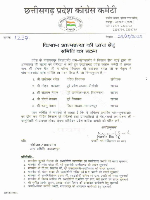 जगदलपुर बस्तर संभाग के नारायणपुर जिले के ग्राम कुकड़ाझोर निवासी किसान हीरा बढ़ई द्वारा की गई आत्महत्या की पड़ताल के लिए कांग्रेस ने पांच सदस्यीय जांच कमेटी का गठन किया है। कमेटी के संयोजक बस्तर के वरिष्ठ विधायक लखेश्वर बघेल बनाए गए हैं। कमेटी जल्द ही मृत किसान के गांव में जाकर वस्तुस्थिति का पता लगाएगी और मृतक के परिजनों तथा अन्य किसानों से चर्चा कर रिपोर्ट तैयार करेगी।