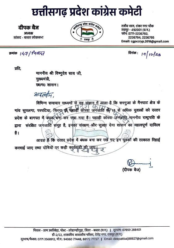 प्रदेश कांग्रेस अध्यक्ष दीपक बैज ने रिहाई के लिए सीएम साय को लिखी चिट्ठी अर्जुन झा जगदलपुर विलुप्ति की कगार पर पहुंच चुके छत्तीसगढ़ की कोरवा जनजाति के करीब डेढ़ दर्जन युवाओं को योगी आदित्यनाथ के यूपी में बंधक बना लिया गया है। वहां के किसी बड़े आदमी ने उन्हें जबरिया रोक रखा है और उनसे वह बिना मेहनताना दिए बंधुआ मजदूरी करा रहा है। बस्तर लोकसभा क्षेत्र के सांसद एवं छत्तीसगढ़ प्रदेश कांग्रेस कमेटी के अध्यक्ष दीपक बैज ने मुख्यमंत्री विष्णुदेव साय को पत्र लिखकर पहाड़ी कोरवा जनजाति के बंधक युवाओं की जल्द रिहाई हेतु पहल करने की मांग की है।