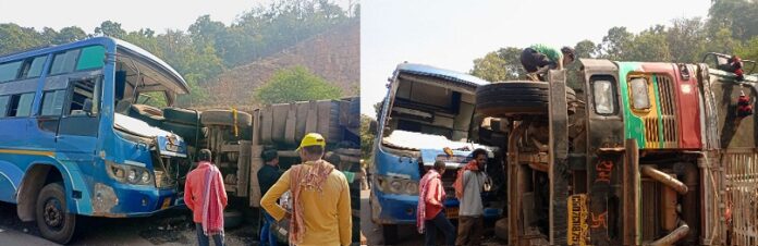 बालोद: मरकटोला घाट के पास ट्रक और यात्रियों से भरी बस टकरा गई। जिससे तीन लोगों की मौके पर मौत | वहीं अन्य लोग घायल सूत्रों से जानकारी के अनुसार कल शाम से ट्रक पलटी हुई साइड में पड़ी थी | आज सुबह 8:30 के लगभग रायपुर तरफ से आ रही जीवन महिंद्रा की बस जो मरकाटोला घाटी के पास ट्रक क्रमाक cg 07 CH 8751 से जा टकरा गई जिससे मौके पर तीन लोग की मौत हो गई वही 12 लोग घायल हुए हैं मौके पर पुलिस पहुंच कर पंचनामा कर आगे की कार्यवाही की जा रही है घायलों को उपचार के लिए नजदीकी प्राथमिक स्वास्थ्य केंद्र के लिए चारामा भेजा गया तीनों मृतक को पोस्टमार्टम के लिए गुरुर भेजा गया है घटना पुरूर थाना क्षेत्र की है फिलहाल पुलिस एवं अधिकारी मौके पर पहुंच चुके हैं तो वहीं बालोद जिले के CMHO भी मौके पर मौजूद है !